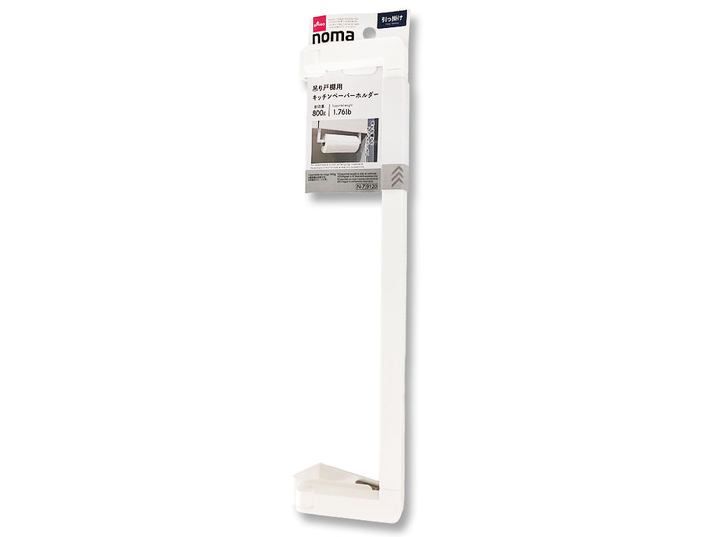 耐荷重量 800g※取り付ける位置によって耐荷重量は異なります。すべり止めシール付き 吊り戸棚の底板に差し込むだけの簡単取り付け 耐熱温度:60℃ 取り付けられる所 厚さ約13から27mmまでの吊り戸棚の底板やシンク・洗面台などの扉 取り付けられない所 天板とのすきまが5mm未満の場合 扉が底板より20mm以上さがっている吊り戸棚 扉と底板のすきまが4mm未満の吊り戸棚 天板 扉 底板 20mm以上 吊り戸棚の内幅が35cm以下の場合 照明器具の付いた吊り戸棚 ※その他、構造により取り付けられない場所もあります。 確認の上、使用してください。 取り付け方法 ①本体からアームを引き抜き、キッチンペーパーを通します。 ②アームを本体にはめます。本品が傾いた状態で扉の開閉をしないでください。●耐荷重量以上の物に使用しないでください。●貴重品や壊れやすいものをかけないでください。●レモンなど柑橘類の皮に含まれるテルペンや、油脂によって変質することがあります。●お子様の手の届かない場所で使用・保管してください。●火や熱源のそばに置かないでください。●変形・破損した場合、直ちに使用を中止してください。●本来の用途以外に使用しないでください。