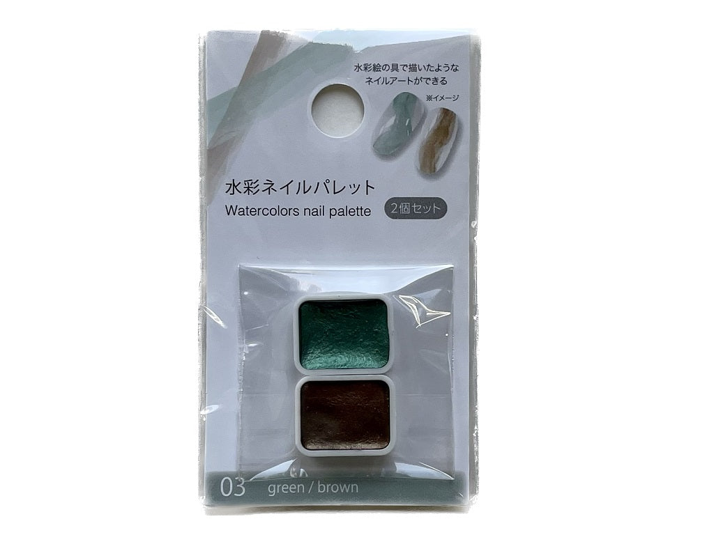 水彩絵の具で描いたようなネイルアートができる 03 greenbrown①ベース作り マットトップジェルを塗り硬化します。※1 ② アート ブラシに水を適量含ませ、パレットの色を溶かしお好みのデザインを作ります。色を重ねたい場合は、乾いてから次の色を塗り重ねてください。 ③ 仕上げ ②を自然乾燥させ、トップジェルを塗り硬化させて完成です。 落とす時 ジェルネイル専用リムーバーをご使用ください。 ※マニキュアにもご使用いただけます。マニキュアの場合、落とす時はネイルリムーバーをご使用ください。 ※1 マットトップコートをベースに使用することで水はじきを防ぎ色がのりやすくなります。使用前に必ず読んでください。また、使用中は保管してください。 ●爪に異常のある場合は使用しないでください。 ●目や口に入った場合は水で洗い流してください。 ●乳幼児の手の届かない場所に保管してください。 ●直射日光・高温の場所を避けて、保管してください。●火や熱源のそばに置かないでください。 ●本来の用途以外に使用しないでください。 ※製造工程でクレーターやヒビ割れが入る場合がありますが、問題なくご使用いただけます。