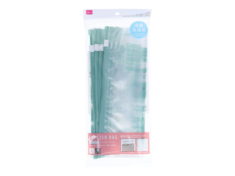 ●食品の保存に ●冷凍・冷蔵用 ●スライダー付で開け閉めラクラク ●ギザギザスライダーで開け閉め実感! ●開閉が心地よいギザギザスライダー ●スライダー付 ●L●イラストはイメージです。●寸法:縦310mm × 横270mm 内寸:縦305mm × 横270mm ●厚さ:0.06mm ●枚数:6枚 ●耐冷温度:-20℃●乳幼児の手の届かない場所に保管してください。●本品は液状の食品を入れると開口部より液漏れする場合があります。ご注意ください。 ●熱い食品に使用しないでください。 ●湯煎はしないでください。 ●密封後、袋を押さえつけたり、重いものを載せたりしないでください。 ●水分が多いものを入れて横置きする場合や、解凍する場合は受け皿などを使用してください。漏れる恐れがあります。 ●調理後の食材を入れる際は、必ず冷ましてから入れてください。 ●液体を入れて持ち運ばないでください。 ●印刷面が皿や食品などに触れないようにしてください。色移りの恐れがあります。●オーブン・オーブントースター・電子レンジは使用しないでください。●尖ったものや鋭利なものを入れないでください。●直射日光・高温の場所を避けて、使用・保管してください。●火や熱源のそばに置かないでください。●本来の用途以外に使用しないでください。