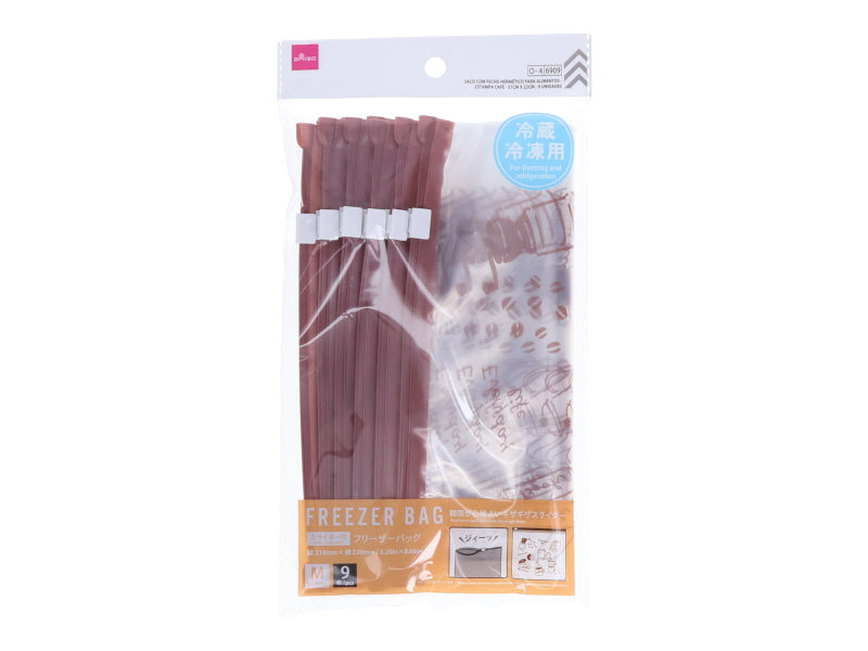 ●食品の保存に ●冷凍・冷蔵用 ●スライダー付で開け閉めラクラク ●ギザギザスライダーで開け閉め実感! ●開閉が心地よいギザギザスライダー ●スライダー付 ●M●イラストはイメージです。●寸法:縦210mm × 横220mm 内寸:縦205mm × 横220mm ●厚さ:0.06mm ●枚数:9枚 ●耐冷温度:-20℃●乳幼児の手の届かない場所に保管してください。●本品は液状の食品を入れると開口部より液漏れする場合があります。ご注意ください。 ●熱い食品に使用しないでください。 ●湯煎はしないでください。 ●密封後、袋を押さえつけたり、重いものを載せたりしないでください。 ●水分が多いものを入れて横置きする場合や、解凍する場合は受け皿などを使用してください。漏れる恐れがあります。 ●調理後の食材を入れる際は、必ず冷ましてから入れてください。 ●液体を入れて持ち運ばないでください。 ●印刷面が皿や食品などに触れないようにしてください。色移りの恐れがあります。●オーブン・オーブントースター・電子レンジは使用しないでください。●尖ったものや鋭利なものを入れないでください。●直射日光・高温の場所を避けて、使用・保管してください。●火や熱源のそばに置かないでください。●本来の用途以外に使用しないでください。
