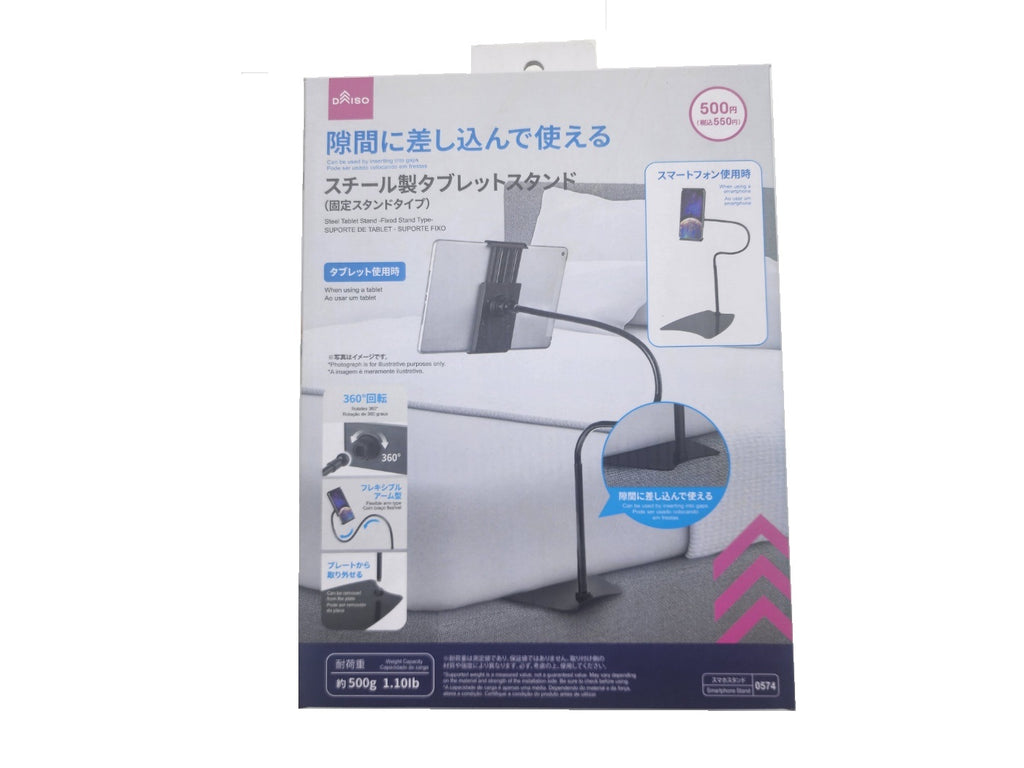 隙間に差し込んで使える スマートフォン使用時 タブレット使用時 デスクで キッチンで 寝室で リビングで 回して固定 プレートから取り外せる 360°回転 フレキシブルアーム型 好みの視点、位置の調節可能セット内容:台座、ホルダー、フレキシブルアーム、留め具 対応サイズ/幅約11.5cm~17cmまでのスマートフォン、タブレット※対応サイズ以外のスマートフォン、タブレットには使用しないでください。耐熱温度:塩化ビニル樹脂(60℃)、ABS樹脂(70℃) 台座にフレキシブルアームを回してしっかり取り付けます。ホルダーをヘッドのボール部分に取り付け、留め具を回して締めます。安定させるためフレキシブルアームを後方に曲げて、固定させます。スマートフォンまたはタブレットをホルダーにしっかり取り付けます。※しっかり取り付けられているか確認してから使用してください。※落下の危険があるので、機器を下に向けて使用しないでください。平らな場所で使用してください。 耐荷重以上のものは取り付けないでください。可動部分に指などを挟まないよう、注意してください。機器を取り付けた状態で本品を移動させないでください。高さ、角度を調節する際は必ず機器を取り外してください。取り付けた場所の下に壊れ物を置かないでください。サイズが合わない場合は使用しないでください。端末によっては本品に設置できない場合があります。本品は完全に固定するものではありません。落としたり、ぶつけたりしないでください。投げたり、振り回したりしないでください。分解や改造をしないでください。直射日光・高温多湿の場所を避けて、使用・保管してください。お子様の手の届かない場所で使用・保管してください。変形・破損した場合、直ちに使用を中止してください。火や熱源のそばに置かないでください。本来の用途以外に使用しないでください。 長期間他の製品と密着させないでください。可塑剤の影響で変質、色移りの恐れがあります。本品使用目的以外の使用に起因するなど、本品の欠陥に基づかない損害については当社では責任を負いかねます。あらかじめご了承の上お買い求めください。