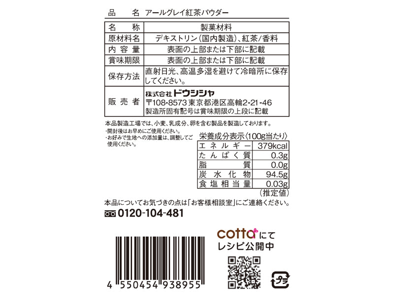 賞味期間(日):395 商品コピー:最終製造場所 東京 特徴:アールグレイの風味はそのままの紅茶エキスパウダーです。アイスやケーキ生地に混ぜてご使用ください。 弊社ルールに沿って賞味期限の管理を行い、順次発送致しております。