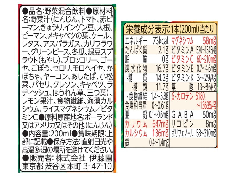 特徴:1本当たり1日の摂取目標量野菜350gを使用した野菜汁100%飲料