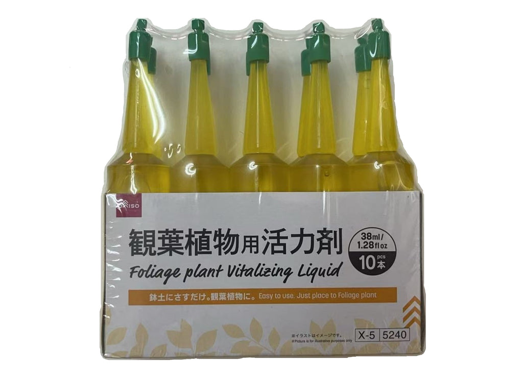 鉢土にさすだけ。観葉植物に。観葉植物用10本入り(1本あたり38ml)キャップの先端をつまみ、アンプル本体を回しねじって切ります。又はハサミでキャップの先端を切り落とします。鉢やプランターの端に差し込みます。12-15cm(4-5寸)鉢に1本を目安にそれより大きい鉢には2-3本与えてください。一年通して2-3週間間隔で注入するのが理想的です。●直射日光・高温多湿の場所を避けて、保管してください。●飲み物ではありません。絶対に口に入れないでください。●万が一口に入れた場合は、コップ一杯以上の白湯、水、砂糖水などを飲んで医師に相談してください。●石灰硫黄剤と混ぜて使用しないでください。有毒ガスが発生する恐れがあります。●液中に浮遊物ができる場合がありますが、効果に影響はありません。●乳幼児の手の届かない場所で使用・保管してください。●本来の用途以外に使用しないでください。●生産に万全を期しておりますが、万一不良の場合にはお買い上げ店にてお取り替えさせていただきます。本品使用目的以外の使用に起因するなど、本品の欠陥に基づかない損害については当社では責任を負いかねます。あらかじめご了承の上お買い求めください。