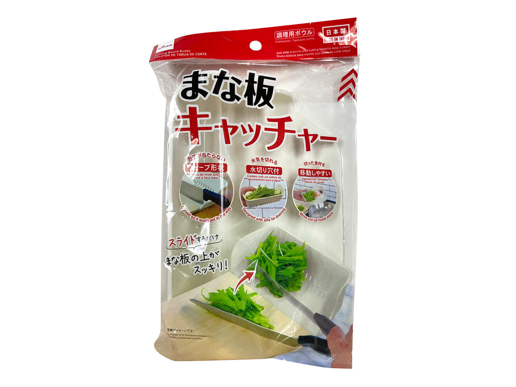 まな板キャッチャーをまな板の下に差し込みます。 切った食材をスライドさせ、まな板キャッチャーに移します。 受幅約18cm まな板●食器洗い乾燥機を使用する際は、取扱説明書を確認してから使用してください。 食器洗い機●使用後は食器用洗剤で洗い、乾燥させてください。なし●食材によっては本品に色がつくことがありますが、品質上問題はありません。 ●熱い鍋など加熱したものをのせないでください。●初めて使用する際は、食器用洗剤等で水洗いしてください。●たわし、又はクレンザーは使用しないでください。●平らな場所で使用してください。●火や熱源のそばに置かないでください。●本来の用途以外に使用しないでください。