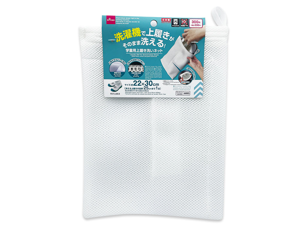 洗濯機で上履きがそのまま洗える! 表面の生地:クッションメッシュ。上履きをやさしく包む。内側片面の生地:ブラシメッシュ。上履き生地面の汚れ落とし。仕切り付き:上履きの偏りを防ぐ。写真はイメージです。洗える上履きの目安:25cmまで1足 上履きを洗濯機で洗うための洗濯ネットです。内側片面にブラシメッシュ素材を使用しており、ブラシ洗い感覚で上履きの生地面の汚れを落とします。ネットはクッションメッシュを使用しておりクッションの効果で洗濯槽と上履きの当たりを吸収し衝撃音を和らげ、洗濯機、上履きを傷めずしっかり洗いげます。ネットに入れるだけで、洗濯から脱水まで安心して使用できます。開け閉めしやすい直線ファスナーで出し入れ簡単です。中央の仕切りは上履きの偏りを防ぎます。2槽式・ドラム式の両方の洗濯機で使用できます。水洗いできない上履きには使用しないでください。上履きの底についた粘土、泥、土、ゴミなどは必ず落としてから使用してください。そのまま洗濯すると洗濯機の故障の原因となります。上履き底の特性によっては十分に脱水ができない場合があります。その際は、取り出す際に水を切るか、入れる向きを変えて再度脱水してください。上履きのデザインによっては入らない場合があります。また、サイズが小さい場合でも2足以上の上履きを入れて洗濯しないでください。洗濯機、洗濯ネット、洗濯物等の破損防止の為、洗濯方法の表示がある場合はそれに従って洗濯してください。乾燥機、乾燥機能は使用しないでください。尖ったものや鋭利なものを入れないでください。漂白剤は使用しないでください。火や熱源のそばに置かないでください。本来の用途以外に使用しないでください。使用後は風通しの良い場所で乾燥させてから保管してください。