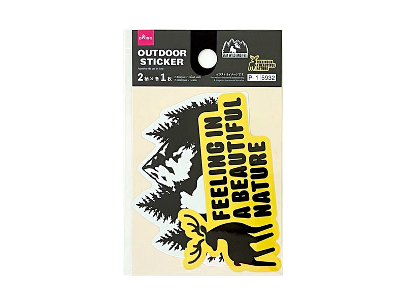 OUTDOOR STICKER 2柄×各1枚●イラストはイメージです。●口に入れたり肌に貼らないでください。●乳幼児の手の届かない場所で使用・保管してください。●直射日光・高温多湿の場所を避けて、使用・保管してください。●火や熱源のそばに置かないでください。●本来の用途以外に使用しないでください。●長期間他の製品と密着させないでください。可塑剤の影響で変質、色移りの恐れがあります。