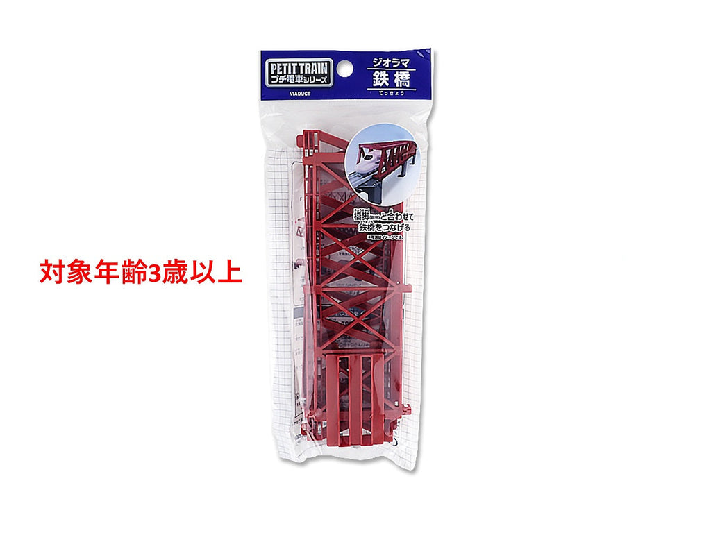 橋脚と合わせて鉄橋をつなげる ※写真はイメージです。対象年齢:3 才以上 〈セット内容〉 側面:2 下面:1〈組み立て方〉 ①側面の中央のへこみに下面をはめます。 ②もう片方の側面も平行にはめます。 ③上面をはめます。 ④橋脚(別売)にはめます。 ⑤直線線路(別売)を真ん中にセットして完成! つなげれば長い鉄橋を作れます。 鉄橋1個以外のパーツは別売です。●誤飲・窒息の危険がありますので、3才未満のお子様へは絶対に与えないでください。 ●デザイン・機能上、尖っている部分がありますので、目などを突いたり踏んだりしないように十分ご注意ください。 ●遊んだ後は、必ず3才未満のお子さまの手の届かない所に保管してください。 ●お子さまが遊ぶ場合は必ず大人が見ているところで遊んでください。 ●火や熱源のそばには置かないでください。 ●落としたり強い衝撃を与えたりしないでください。 ●本品は、安全性と遊びやすさを配慮してやわらかい素材を使用しています。そのため反りやねじれが多少出る場合がありますが不良ではありません。平らに直してご使用ください。 ※改良のため商品の色・形がパッケージの写真と異なる場合があります。
