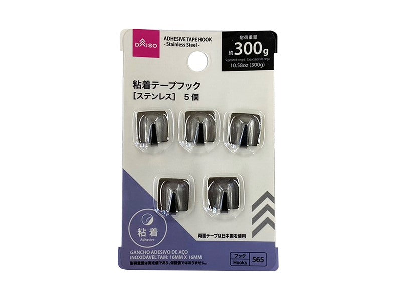 両面テープは日本製を使用 5個 耐荷重量:約300g 耐荷重量はあくまでも目安です。取付け場所の材質・環境により多少異なります。取り付け方 取り付け場所のホコリ・油分・水分・汚れを取り除きます。 粘着面に手が触れないように剥離紙をはがします。 取り付け面に強く押し付けるようにして取り付けます。 取り外し方 壁とフックの間にナイフを差し込み、裏面に付いている粘着テープを切り取ります。 ※手や指などを切らないように注意してください。 ※壁などが傷つく恐れがあります。十分に注意してください。 取り付け可能な場所 木質新建材・柱・ガラス・タイル・ステンレス・金属塗装面 取り付け不可能な場所 土壁・しっくい・壁紙・クロス貼り・ビニール壁紙・水性塗装壁・高温多湿な場所 掛けられない物 時計・額ぶち・ガラス製品などの貴重品や壊れやすい物取り外した際、壁に傷が付いたり、跡が残る恐れがあります。 万一の落下・脱落に備えて、取り付け場所の周辺に人がいないことや壊れものなどを置かないようにしてください。 耐荷重量以上の物をかけないでください。 取り付け場所の材質によりフックの強度が多少異なります。 荷重が垂直下方向以外に掛からないようにしてください。 貴重品や壊れやすいものをかけないでください。 直射日光・高温多湿の場所を避けて、使用・保管してください。 お子様の手の届かない場所で使用・保管してください。 変形・破損した場合、直ちに使用を中止してください。 火や熱源のそばに置かないでください。 本来の用途以外に使用しないでください。 生産に万全を期しておりますが、万一不良の場合にはお買い上げ店にてお取り替えさせていただきます。本品使用目的以外の使用に起因するなど、本品の欠陥に基づかない損害については当社では責任を負いかねます。あらかじめご了承の上お買い求めください。