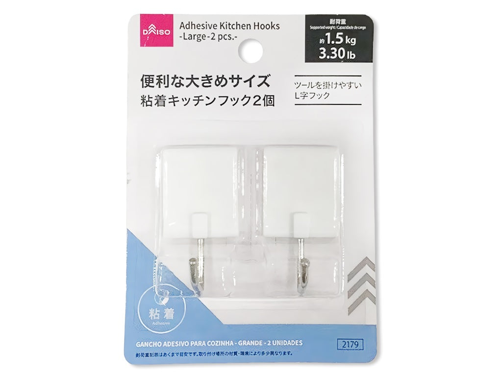 便利な大きめサイズ 耐荷重1.5kg ※取り付ける位置によって耐荷重は異なります。取り付け可能な場所 【凹凸の無いなめらかな面】 板壁、化粧合板、タイル、ガラス、ステンレス、冷蔵庫・洗濯機などの金属塗装面、プリント合板 取り付け不可な場所 【凹凸、ザラザラ、表面がはがれやすい面】 布壁、壁紙、ビニル壁紙、土壁、しっくい、モルタル、水性塗装壁、塗装合板、キッチン・浴室などで 特に水滴のつく所、水のかかる所、レンジ・ストーブなどで高温になる所、模様のあるタイル 取り付け方法 1.壁をぬれ雑巾などでしっかり拭き、よく乾かします。※油分やワックスはベンジンで拭き取ってください。 2.粘着面に手を触れないように裏面に付いているはくり紙をゆっくりとはがします。 3.粘着面を強く押し付け、しっかりと固定させます。取り付け後、粘着力が安定するまで、約1日程放置してから使用してください。 取り外し方法 ①壁とフックの間にナイフなどをさし込み、裏側に付いている粘着テープを切り取ります。 ※手を切らないように注意してください。 ※壁などにキズが付く恐れがあります。 ②布や指などで壁に残ったテープをこすり取ります。●使用前に、必ず「取り付け可能な場所」を確認してください。●壁に汚れ・ホコリ・湿気・油分・ワックスなどがあると付きません。●冬期はドライヤーなどで粘着面を温めて付けてください。●取り付け場所の材質により、耐荷重が多少異なります。●フックを下方向以外に引っ張ったり、先端部分のみに加重したりしないでください。●ロープを張るなど、斜め方向から荷重をかけないでください。●衝撃のかかるかけ方はしないでください。●熱を帯びたものをフックにかけないでください。●複数のフックを合わせて使用しないでください。●使用状況により、サビが発生する場合があります。●貴重品や壊れやすいものをかけないでください。●耐荷重以上の物をかけないでください。●取り付けた場所の下に、壊れやすいものや貴重品を置かないでください。●レモンなど柑橘類の皮に含まれるテルペンや、油脂によって変質することがあります。●変形・破損した場合、直ちに使用を中止してください。●お子様の手の届かない場所で使用・保管してください。●火や熱源のそばに置かないでください。●本来の用途以外に使用しないでください。