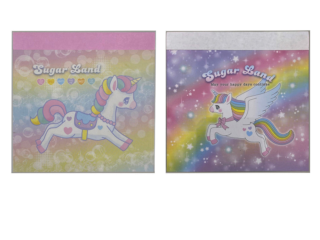 透明カバーがついたファンシー柄のメモパッド。100枚。ユニコーンA柄とユニコーンB柄アソート。小型で使いやすい正方形です。紙で手をきらないようにご注意ください。