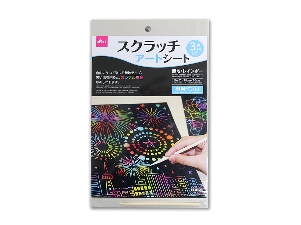 専用ペン付 シート3枚入り●写真はイメージです。自由にかいて楽しむ無地タイプ。 黒い面を削ると、カラフルな色があらわれます。付属の専用ペンで黒い面を削ると、カラフルな色があらわれます。 好きな文字やイラストをかいたり、好きなサイズ・形に切ったりして楽しみましょう。付属の専用ペンは先がとがっています。取り扱いに注意してください。 専用ペンを人に向けたり、目を突いたりしないでください。●玩具ではありません。●乳幼児の手の届かない場所で使用・保管してください。●火や熱源のそばに置かないでください。●本来の用途以外に使用しないでください。