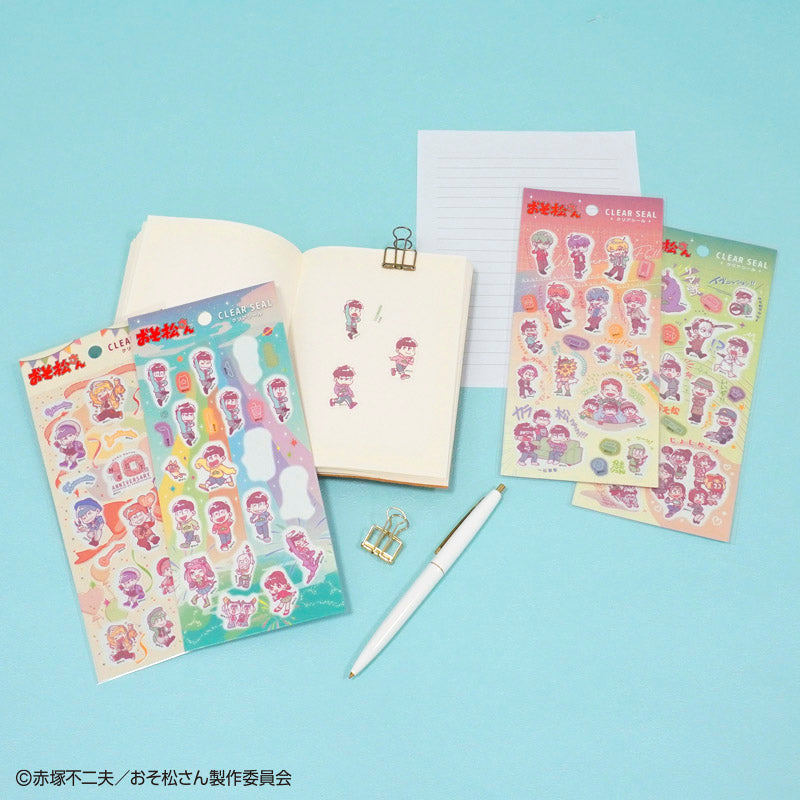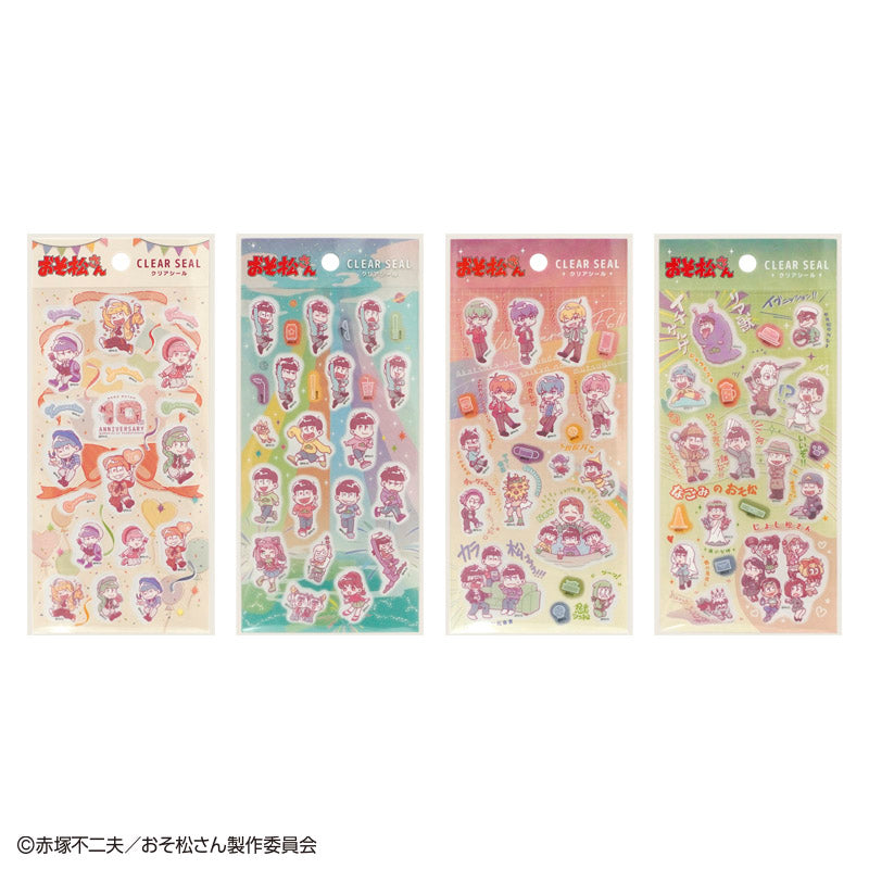 透明仕様のクリアシール。おそ松さんの10周年を記念したミニキャライラストのデザインです。クリアシール。透明仕様のクリアシール。おそ松さんの10周年を記念したミニキャライラストのデザインです。クリアシール。直射日光の当たる場所、高温多湿になる場所で保管しないでください。お子様の手の届く場所で使用・保管しないでください。本来の用途以外でのご使用はおやめください。本品を火気に近づけないでください。貼り付ける面の水や油、ほこりをよく拭き取ってください。本品を剥がす際、貼り付け面を傷つけたり、糊残りや色移りする場合があります。ご使用の際は十分ご注意ください。高価な物や傷んで困る物等には使用しないでください。口に入れたり、肌への貼り付けはおやめください。