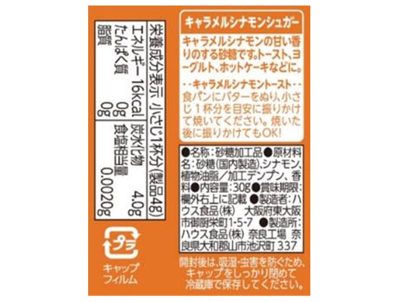 特徴:キャラメルシナモンの甘い香りのする砂糖です。食パンにバターをぬり、小さじ1杯分を目安に振りかけて焼いてください。/n焼いた後に振りかけてもOK。/n食パン1枚に小さじ1杯分を目安に。トースト、ヨーグルト、ホットケーキなどに。