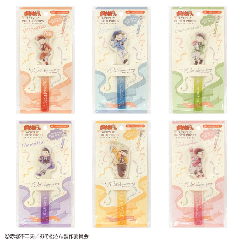 写真撮影などに使えるアクリルフォトプロップス。おそ松さんの10周年を記念したアニメ描き下ろしイラストのデザインです。写真撮影用アイテム。写真撮影などに使えるアクリルフォトプロップス。おそ松さんの10周年を記念したアニメ描き下ろしイラストのデザインです。写真撮影用アイテム。直射日光の当たる場所、高温多湿になる場所で保管しないでください。本品の保護フィルムを剥がしてからご使用ください。本来の用途以外でのご使用はおやめください。本品を火気に近づけないでください。商品の性質上、本品にキズがつく場合があります。破損の原因になりますので、強く引っ張ったり強い力を加えないでください。鋭利な部分で顔や目を突かないようご注意ください。本品が破損したり変形した場合はご使用をおやめください。