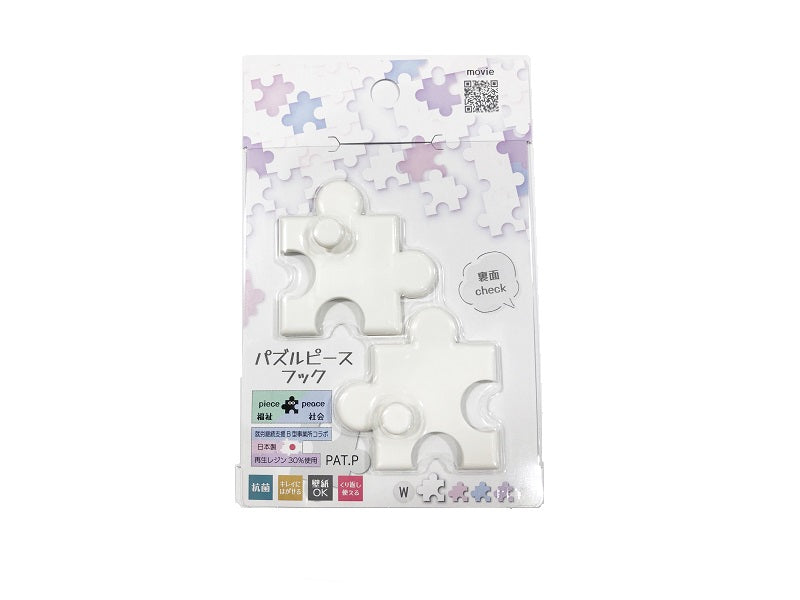 抗菌、きれいにはがせる、壁紙OK、くり返し使えるパズルを組み合わせてキーホルダーや髪ゴムなど小物かけに特殊な吸着シートを使用しているので、ステンレス、鉄、タイル、ガラス面などの光沢面やマグネットのつかない平滑面やビニル製壁紙に貼れます。1.はじめに、取り付ける壁面の汚れや水分をきれいに拭き取り、よく乾かします。2.パズルピースフック背面の粘着テープからはく離フィルムをはがします。3.使用する壁面に全体をしっかり押し付けます。取り外し方基本の取り外し方壁面に押し付けながら左右どちらかにゆっくりとねじって外してください。壁面に押し付けながら回転させるイメージです複数取り付けた場合硬い棒状のものを使ってフック部分に引っかけ、左右どちらかにゆっくりとねじって外してください。動画で詳細を説明していますのでQRコードからご確認ください。再利用可能パズルピースフックは何度でも貼ってはがせます。粘着力が落ちてきたと感じたら粘着面を流水で擦り洗いをし、じゅうぶんに乾かすと粘着力が復活します。取り付け可能な面ステンレス、鉄、タイル、ガラス面、メラミン化粧板、プラスチック面 ビニル製の壁紙など、粘着面がよくつく平滑でツルツルした面取り付け不可能な面ビニル製以外の壁紙、漆喰壁、布、繊維、ブロック、レンガやその他凹凸の激しい面、フッ素樹脂加工した面、特殊防水加工した面など、その他ザラザラした面無し直射日光、高温多湿を避けて保管してください。お子様の手の届かない場所に保管してください。事故を防ぐためにこの取扱説明書の内容をよくお読みいただき、じゅうぶんにご理解のうえご使用ください。本品を取り外した際、稀に貼った面に変色やシミあとが残る場合があります。また、壁面の状態や表面層によっては取り外しの際に少し表層面が破損する場合がありますので、あらかじめ目立たない部分でテストしてからご使用ください。壁紙の継ぎ目や浮き・破れがある場所、穴が開いている所には絶対に貼らないでください。はがした時に壁面が破損する恐れがあります。はがすときは本品をゆっくりとねじり取ってはがしてください。無理に強くはがすと本品や壁面が破損する恐れがありますのでじゅうぶんにご注意ください。一度本品を使用して、はがすと粘着面にほこりなどの汚れが付着し、粘着力が低下します。再度使用する際は粘着面を水洗いしてください。水洗いすることで粘着力が戻ります。水洗いした場合はドライヤーで温めるなど、よく乾燥させてからお使いください。貴重品や破損しやすいものには絶対に使用しないでください。変形・破損した場合、直ちに使用を中止してください。火や熱源のそばに置かないでください。本来の用途以外に使用しないでください。