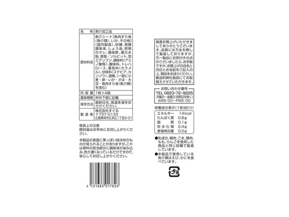 特徴:魚肉すり身のシートを甘辛いタレに漬けこみました。