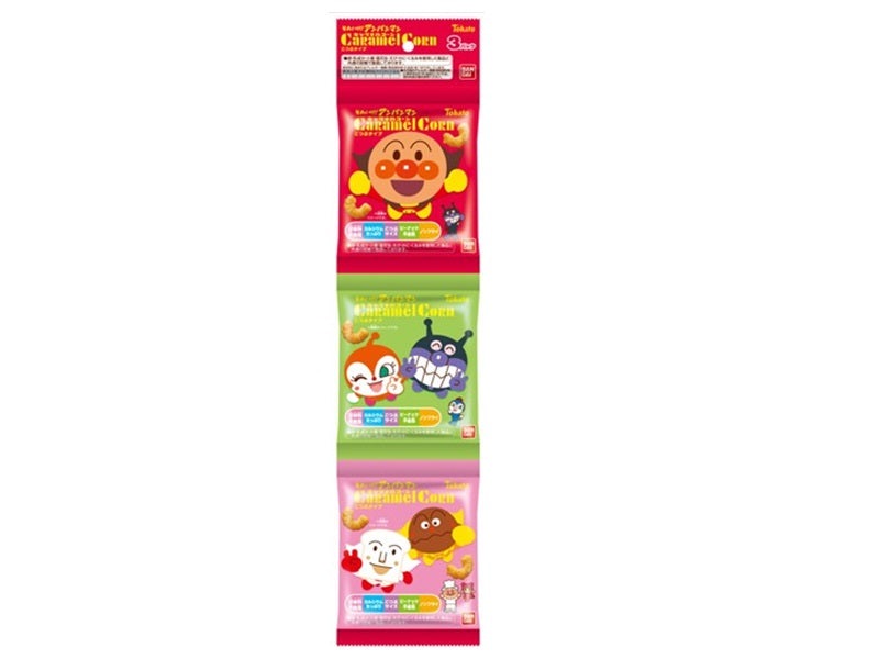 特徴:お子様にもうれしいカルシウム入りで甘味料不使用のノンフライスナック。お子様も食べやすいちっちゃいキャラメルコーンです。アンパンマンで人気の高いキャラクターをデザインした、小分けで配れる3袋の吊り下げ包装です。