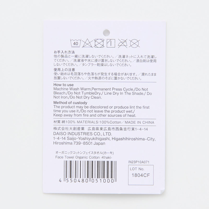 吸水性が良く甘撚りの糸でやわらかい肌触りに仕上げました。 フックにかけられる便利なループタグ付き。浴室、洗面所、台所に 良質なインド産オーガニックコットン使用。他の製品と一緒に洗濯しないでください。 洗濯ネットに入れて洗濯してください。 洗濯液や水に浸け置きしないでください。 漂白剤は使用しないでください。 タンブラー乾燥はしないでください。●使いはじめは毛羽落ちや色落ちが発生する場合があります、●濡れたまま放置しないでください、●火や熱源のそばに置かないでください