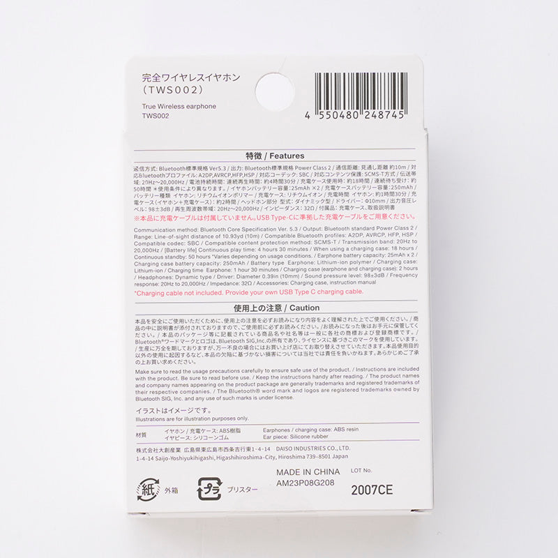 片耳でも使える ハンズフリー通話対応 音声アシスタント対応 最大再生約18時間※英訳文字数オーバーのため英訳のみ分割記載、日本語は使用方法セルに収まっています。通信方式:Bluetooth標準規格Ver5.3 出力:Bluetooth標準規格PowerClass2 通信距離:見通し距離約10m 対応Bluetoothプロファイル:A2DP、AVRCP、HFP、HSP 対応コーデック:SBC 対応コンテンツ保護:SCMSーT方式 電池持続時間:連続再生時間:約4時間30分 充電ケース使用時:約18時間 連続待ち受け:約50時間 *使用条件により異なります。 イヤホンバッテリー容量:25mAh×2 充電ケースバッテリー容量:250mAh バッテリー種類:イヤホン/リチウムイオンポリマー、充電ケース/リチウムイオン 充電時間:イヤホン:約1時間30分 充電ケース(イヤホン+充電ケース):約2時間 ヘッドホン部分:型式:ダイナミック型 ドライバー:直径10mm 出力音圧レベル:98±3dB 再生周波数帯域:20Hz~20、000Hz インピーダンス:32Ω 付属品:充電ケース、取扱説明書 対応機種:Bluetooth対応の機器 (スマートフォン、携帯電話、パソコン、タブレット、各種ミュージックプレーヤー等) ※各プロファイルが対応していること完全ワイヤレスイヤホン 取扱説明書 【同梱物】充電ケース、イヤホン本体、取扱説明書(本書) ※本品に充電ケーブルは付属していません。USB Type-Cに準拠した充電ケーブルをご用意ください。 【各部名称】充電ケースLED、USB Type-Cポート、L/R表記、充電端子、イヤーピース、イヤホンLED、操作タッチセンサー 本品をご使用になる前に、充電ケースとイヤホンの充電を行なってください。 【充電する】充電ケースを充電する:充電ケースのUSB Type-Cポートに充電ケーブルを接続して充電してください。 本品に充電ケーブルは付属していません。USB Type-Cに準拠した充電ケーブルをご用意ください。 充電中はLEDが赤く点滅し、完了すると赤く点灯します。 イヤホンを充電する:充電が完了した充電ケースにイヤホンを収納してください。イヤホンLEDが赤く点灯し充電が開始されます。充電が完了するとイヤホンLEDが青く点灯し、消灯します。イヤホン充電中、イヤホンLEDは赤く点灯、充電ケースLEDは緑色に点灯します。 イヤホンを収納した状態で充電ケースの充電がなくなると、イヤホンの電源が自動でONになりペアリングモードに移行する場合があります。イヤホンの電池残量が少なくなると、電子音によるアナウンスがあります。接続先機器のイヤホン電池残量表示は、片側イヤホンの電池残量の表示です。イヤホン本体は電池が無くなった方から先に電源がOFFになります。(片側はONの状態)イヤーピースを所定の位置に装着しないとケースと干渉するなどして充電できなくなる場合があります。また、強い衝撃を与えると、充電ケースからイヤホンが外れ充電できなくなる場合があります。長期間使用しない場合はバッテリーの自己放電による劣化を防ぐため数か月に一度を目安に充電してください。 イヤホン収納時に充電ケースのLEDが緑色に点滅した場合、充電ケースの電池残量が残り少ない状態です。充電ケースを充電してください。 【ペアリングして接続する(機器への初期登録)】 ①充電ケースからイヤホンを取り出す。充電ケースから両側のイヤホンを取り出すと、自動でイヤホン同士のペアリングが完了し、親機側のイヤホンがペアリングモードになります。ペアリングモード中は親機側のイヤホンLEDが赤と青に交互に点滅します。 ②接続先機器のBluetooth設定から、本品を検索、登録しペアリング完了。【設定】をタップ、【Bluetooth】、Bluetooth ON、「DAISO_TWS002」を選択しペアリング完了 一度ペアリング設定をすると、次回以降は自動でペアリングを行います。別機器とペアリングしたい場合は、接続中の機器とのBluetooth接続を切り、再度①~②の手順でペアリングしてください。 【ペアリングがうまくできない時】接続先機器のBluetooth機能が使用可能な状態か確認してください。接続先機器が本品のプロファイルに対応しているか確認してください。接続先機器のBluetooth設定から本品の登録情報を削除し、再度登録を試みてください。 【電源のON/OFF】取り出すと自動でON、収納すると自動でOFF 電源をONにする:イヤホンを充電ケースから取り出すと、電源が自動でONになります。手動で電源をONにする場合は、電源がOFFの状態から、イヤホンの操作タッチセンサーを約3秒間長押ししてください。イヤホンLEDが青く点灯し電源がONになります。電源をOFFにする:イヤホンを充電ケースに収納すると、電源が自動でOFFになります。手動で電源をOFFにする場合は、電源がONの状態から、イヤホンの操作タッチセンサーを約5秒間長押ししてください。イヤホンLEDが赤く点灯した後、電源がOFFになります。接続機器との通信が途切れ接続が解除されると、節電モードに移行します。節電モードのまま再接続されない場合、数分で自動的に電源がOFFになります。 【操作方法】本品はタッチコントロールタイプのイヤホンです。イヤホンの操作タッチ