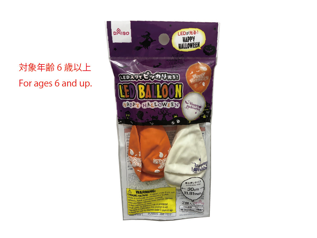 対象年齢6歳以上 保護者の方へ 必ずお読みください 小部品があります。誤飲・窒息の危険がありますので、3歳児未満へのお子様へは絶対に与えないでください。LED内蔵の光る風船です。①安全な場所で使用してください。 ②風船の口にある紙を抜いてLEDのスイッチを入れます。 ③その後、風船を膨らませる際は、ポンプの使用をおすすめします。 ④ガスを入れて膨らませることも可能です。 ⑤PULLと書かれた紙を抜くとライトが点灯します。 ⑥点灯時間は約12時間。 ⑦オン・オフはできません。 ⑧破れた風船はすぐに捨ててください。 イベントの装飾や空間演出におすすめです。 絶縁シート直射日光・高温の場所を避けて、保管してください。●ボタン電池は飲み込むと危険です。 ●お子様の手の届かない場所に保管してください。 ●万一飲み込んだ場合は、すぐに医師に相談してください。 ●乳幼児の手の届かない場所で使用・保管してください。 ●8才未満のお子様は、膨らんでいない風船や破れた風船を吸い込まないよう注意してください。窒息などの危険があります。保護者の方が注意することが必要です。膨らませていない風船は、お子様の手の届かないところに置いてください。破れた風船は、すぐにお捨てください。 ●本品を使用する際は、保護者監督のもと使用してください。 ●本品は使い捨て商品です。一度使用した風船は再使用しないでください。 ●電池交換はできません。 ●水で濡らさないでください。 ●風船に付着している白い粉はデンプンです。 ●肌に異常を感じた場合は、直ちに使用を中止してください。体質により、かゆみ、かぶれ、発疹など起こす場合があります。 ●周囲の安全を確認した上で使用してください。 ●空気を入れすぎないでください。 ●膨らました風船の上に乗ったり、重いものを乗せたりしないでください。 ●膨らんだ風船が目にあたらないように注意してください。 ●静電気にふれた場合、破損する恐れがあります。 ●尖ったもので傷つけないでください。 ●指に巻き付けないでください。 ●風船の印刷部分は舐めないでください。 ●破損した場合、直ちに使用を中止してください。 ●火や熱源のそばに置かないでください。 ●本来の用途以外に使用しないでください。 ●ポンプを使用して膨らませてください。 ●破れた風船はすぐに捨ててください。 ●玩具ではありません。インテリア商品です。 ●膨らませすぎに注意してください。 ●表記サイズ以上に絶対に膨らませないでください。 表面記載の空気注入サイズ以上に風船を膨らませると破裂の恐れがあります。風船の破裂については当社では保証できませんのでご了承ください。