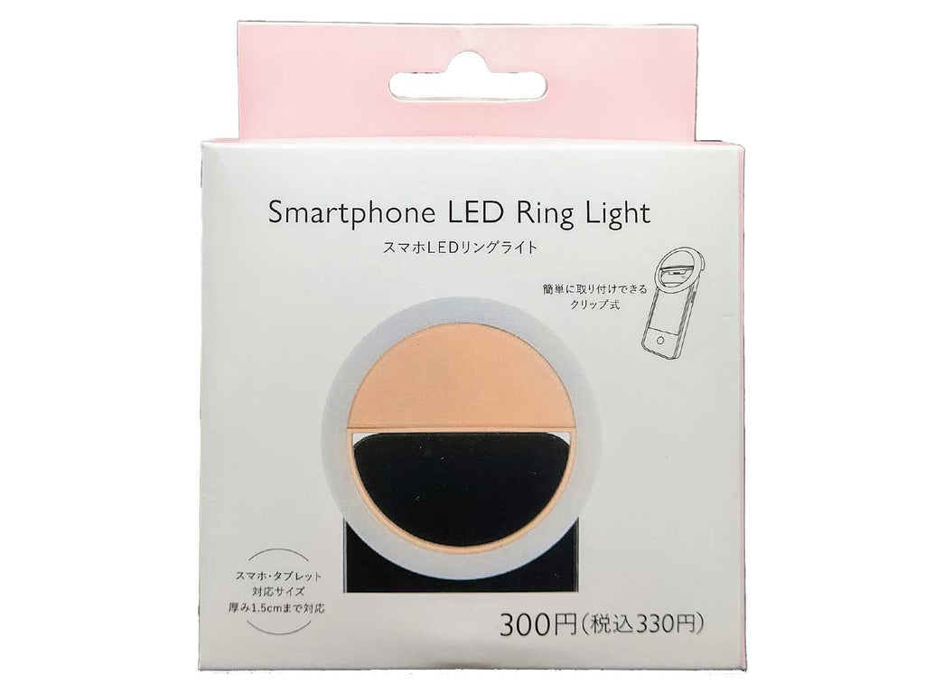 スマホLEDリングライト この度は本品をご購入いただきありがとうございます。使用前に本取扱説明書を最後までお読みいただき、正しくお使いください。読み終わった後は、大切に保管してください。 □LEDリングライト本体 □充電用ケーブル ※ACアダプタは別売です。 □本取扱説明書 ●写真はイメージです。●イラストはイメージです。スマホ・タブレット対応サイズ厚み1.5cmまで対応 簡単に取り付けできるクリップ式 鏡に取り付けてメイクライトとして 明るさ3段階調整可能 自撮り・リモート撮影時の補正ライトとして USB充電タイプ 手軽にスマホやタブレットに取りつけられるクリップ式LEDライト 長押しでエマージェンシーライトとしても使用できます 写真撮影・配信時・WEBチャット時の補正ツールとして LED面を外向きに装着し被写体への撮影にも各部名称 本体表面 LEDライト 本体裏面 スイッチ クッション 本体上面 ケーブル差込口 クリップ スマホ・タブレット対応サイズ 厚み1.5cmまで対応 外側につけて撮影用ライトとして 内側につけて自撮りライトとして 鑑に取りつけてメイクライトとして ※端末のケース形状によっては取り付けができないことがあります。また、端末によっては装着時、本品がカメラ部分に干渉することもあります。ご了承ください。 材質:ABS樹脂 Materials:ABS resin LED電球数:28灯 電池容量:リチウムイオン電池60mAh 充電電圧:DC5V 最大充電電流値:500mA 充電時間:約1-2時間(※) 点灯時間:約30-55分(※) ケーブル長:15cm(コネクタ除く) 対応サイズ:1.5cmまで サイズ:W8.5cm×D3.5cm×H8.5cm Size:W3.34in×D1.37in×H3.34in ※数値は使用する明るさのレベルや使用環境により異なります。 MADE IN CHINA (株)大創産業 広島県東広島市西条吉行東1-4-14充電方法 付属ケーブルをACアダプタ(出力5V1A以下/別売)と本体差込口へ接続すると充電ランプが赤く点灯し、充電がはじまります。約1-2時間で充電が完了し、ランプが消灯します。 充電用microUSBケーブル ACアダプタ(※付属しません) microUSB端子差込口 ※充電後は速やかにケーブルを外してください。 ※コネクターは接続の方向を確認して、しっかりと奥まで差し込んでください。 ※一度曲がったコネクターは使用しないでください。 ※必ず付属の充電ケーブルを使用してください。 ※本品を充電しながら使用はしないでください。 ※長期間使用しない場合、内蔵バッテリーが消耗しているため定期的に充電を行ってください。 使用方法 1/本体クリップを開き、端末に取り付けます。 ※厚み1.5cmまでの端末に対応しています。 ※取り付け時、本品が落下しないよう端末に確実に固定してください。 2/本体裏側面のスイッチを押すとLEDが点灯します。スイッチを押すごとに明るさのレベルが3段階変わります。 ライトの明るさ 暗 明 電源OFF 電源ON 第1段階調光 第2段階調光 第3段階調光 電源OFF ●スイッチ長押しでライトが点滅し、エマージェンシーライトとしても使用できます。 ●充電する際は、充電ケーブルをACアダプタ(出力5V1A以下/別売)と本体へ接続してください。●柔らかい布で汚れを拭き取ってください。死亡または重傷を負う恐れがある内容です。 軽傷や物的損害を負う恐れがある内容です。 本品は防水仕様ではありません。濡れた手で使用しないでください。 直射日光・高温多湿、ホコリの多い場所や暖房機器の熱が当たるような場所で使用・保管しないでください。 本品LED(光源)を長時間直視しないでください。目に悪影響を及ぼす場合があります。 思わぬ事故が起きないよう目の届く範囲で使用してください。 クッション以外の部分で固定すると端末が傷つく恐れがあります。 本品を使用して撮影する際は、周囲の安全を充分に確認してください。 スマートフォンケースを装着していたり、端末のサイズや厚みによってはクリップが挟めない場合があります。 使用環境の周囲の明るさによりLEDライトの効果が異なります。 本品はリチウムイオンを使用しています。 通常の家庭ごみとして廃棄することはできません。 廃棄の際は、各地方自治体の廃棄区分に従ってください。 ※商品の仕様および外観などは商品改良のため予告なく変更することがあります。 ※パッケージに記載の社名および製品名は各社の商標または登録商標になります。 生産に万全を期しておりますが、万一不良の場合にはお買い上げ店にてお取り替えさせていただきます。本品使用目的以外の使用に起因するなど、本品の欠陥に基づかない損害については弊社では責任を負いかねます。あらかじめご了承の上お買い求めください。 使用前に同梱の取扱説明書をよく読み、正しく使用してください。 本品を取り付ける際は端末に確実に固定してください。 本品を充電しながら使用しないでください。 使用環境の周囲の明るさによりLEDライトの効果が異なります。●シンナー、ベンジン、アルコール等は付着させないでください。●分解や改造をしないでください。●無理な力や強い衝撃を与えないでくだ