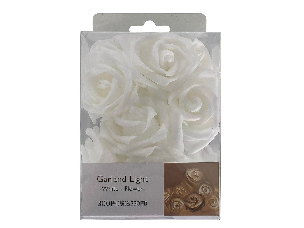ガーランドライト(WH、10LED、フラワー)LEDの数:10球 使用電池:単3乾電池(1.5V)×2本(3V) 消費電流:0.167A 連続点灯時間:未使用電池使用 約48時間 ※電池は別売りです。電池の入れ方 蓋をスライドさせ開け、電池は+と-の向きを確認してからセットしてください。 スイッチをON方向にスライドするとライトが点灯し、スイッチをOFF方向にスライドするとライトが消灯します。●使用する前に必ずお読みください。 ●また使用中に保管してください。 ●以下のことを守らないと、けが、電池の液漏れ、発熱、発火の原因となります。 ●光をのぞきこんたり、直接目に当てたりしないでください。 ●LEDは熱を持つことがあります。使用中、使用直後は直接触らないでください。 ●雨がかかる場所や結露しやすい場所の設置しないでください。また濡れた手で本品を触らないでください。感電の原因となります。 ●光の色や明るさにばらつきが出る場合があります。 ●特定の色の光が弱くなった場合は、新しい電池に交換してください。 ●電球の交換はできません。 ●温度、湿度の変化が大きい場所、酸、アルカリ、油を使用する場所やほこりの多い場所では使用・保管しないでください。 ●変形・破損した場合、直ちに使用を中止してください。 ●火や熱源のそばに置かないでください。 ●本来の用途以外に使用しないでください。●新しい電池と古い電池、種類の違う電池を混ぜて使用しないでください。●二次電池(充電式電池)は、絶対に使用しないでください。●電池はプラスマイナスを正しくセットしてください。●長期間使用しない場合は電池を外してください。●お子様の手の届かない場所で使用・保管してください。●本品は防水仕様ではありません。●分解や改造をしないでください。●シンナー、ベンジン、アルコール等は付着させないでください。●本品使用目的以外の使用に起因するなど、本品の欠陥に基づかない損害については当社では責任を負いかねます。あらかじめご了承の上お買い求めください。