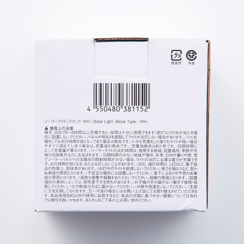 ガーデン飾り用です。電圧:1.2V 電流:0.025A 屋外用ガーデンソーラーライトです。本品はIP66ですが、完全防水ではありません。 日中、ソーラーパネルに太陽光が当たると、電気エネルギーに変換され、内臓充電池に蓄電します。 夜になると、日中充電した電気を使ってライトが自動的に点灯します。フル充電の場合、約6ー8時間点灯します。 電源がOFFの状態では充電も点灯もできません LEDチップの交換はできません 電池の交換はできません。初めにお使いになる場合は、スイッチをONにしてソーラーパネルを直射太陽光に当てて、十分な充電を行って上で使用してください。屋内照明では充電されません。 ソーラーパネルは、必ず直射日光の当たる場所に設置してください。 設置場所は、南向きが最適です。 朝から夕方にかけて太陽光が当たる場所に設置してください。 時間帯により太陽光が当たらない設置場所では充電不足となり、点灯時間が短くなる場合や点灯しない場合があります。 特に冬季は日照時間が短くなります。 雪やホコリがソーラーパネルについたままにならないよう、こまめなお手入れをしてください。 夜間、周囲が明るくなる場所には設置しないでください。街灯などの光が当たる場所に設置しないでください。点灯しない場合があります。 雨などによる浸水や積雪のない場所、湿気の少ない場所、落下などの危険がない場所に設置してください。 水没する恐れのある場所では使用しないでください。 ライトが暗い 点灯するがすぐ消えてしまう 日中、灯具が樹木や建物などの日陰になりませんか 日中、樹木や建物などの日陰にならない所に設置場所を変更してください。 ソーラーパネルに汚れがありませんか 汚れていたら、水で湿らせた柔らかい布でパネルカバーの汚れやホコリをふき取ってください。 日中が曇りや雨の日が続いていませんか 晴天の日に電源を「ON」にし、フル充電を行ってください。 ライトが点灯しない 電源スイッチが「OFF」になっていませんか 電源スイッチを「ON」にしてください。 設置場所付近に明るい照明がありませんか 近くに明るい照明がない所に設置場所を変更してください。 ※天候の具合や設置場所により、点灯時間が徐々に短くなることがあります。その際は一度フル充電を行うと、本来の点灯時間で使用できます。 スイッチについて 電源スイッチは、ソーラーパネル部分の裏側にあります。 下図参照 電源スイッチONにします。定期的に水で湿させた柔らかい布で、埃や汚れをふき取ってください。(洗剤類は使用しないでください) ソーラーパネルが汚れていると太陽光の透過率が低下し、十分な充電ができなくなります 水の中につけて洗うことは絶対しないでください。 特に、冬季は日照時間が少ないため、雪や埃がソーラーパネルについたままにならないよう、こまめなお手入れをお勧めします晴天、日光で6ー8時間以上充電すると、夜間は十分に使用できます 街灯などの光が当たる場所に設置しないでください。パネルが明るさを感知してライトが点灯しない場合があります。 フル充電をしても点灯時間が短くなってきた場合は寿命です。十分な充電をした後でもライトが暗い場合やすぐに消しえてしまう場合は、充電池の寿命です。 充電池寿命は約1年です。 日照時間によって充電量が異なります。 ソーラーライトの点灯時間は、使用する地域、設置場所、季節や天候の日照条件などに左右されます。 日照時間の少ない地域や場所、冬季、日中が曇りや雨、雪でソーラーパネルへの太陽光の照射時間が少ない場合、ライトの点灯に必要な電力が充電できず、点灯時間が短くなる、または点灯しないことがあります。 点灯、滅灯時間は、LEDなど、電子部品の性質上、固体差があります 点灯中のライトを直視しないでください。視力を損なうなど、思わぬ事故の原因となります。 不安定な場所には設置しないでください。落下によるけがや思わぬ事故の原因となります。 過度な衝撃や振動をあたえないでください。故障の原因となります。 設置場所の素材によっては、突然落下する恐れがあります。●お子様の手の届かない場所で使用・保管してください。●火や熱源のそばに置かないでください。●分解や改造をしないでください。●生産に万全を期しておりますが、万一不良の場合にはお買い上げ店にてお取り替えさせていただきます。本品使用目的以外の使用に起因するなど、本品の欠陥に基づかない損害については当社では責任を負いかねます。あらかじめご了承の上お買い求めください。