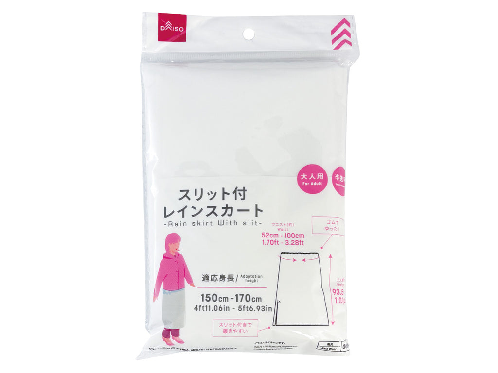 適応身長(約):150cmー170cm丈(約):93.5cmウエスト(約):52cmー100cm雨の日に着るレインウェア●濡れたまま放置しないでください。●使用後は乾燥させてください。●直射日光・高温多湿の場所を避けて、保管してください。●お子様の手の届かない場所に保管してください。●使用前に必ずお読みください。また使用中は保管してください。●本品は簡易用です。激しい雨風には対応できません。●本品を着用して、自転車やバイク等に乗らないでください。●破れや穴等の破損がある場合は、使用しないでください。●本品を着用したまま激しい動きをしないでください。●サイズが合わない場合は使用しないでください。●強く引っ張らないでください。●尖ったものや鋭利なものに触れさせないでください。●肌に異常を感じた場合は、直ちに使用を中止してください。●火や熱源のそばに置かないでください。●本来の用途以外に使用しないでください。●本品使用目的以外の使用に起因するなど、本品の欠陥に基づかない損害については当社では責任を負いかねます。あらかじめご了承の上お買い求めください。
