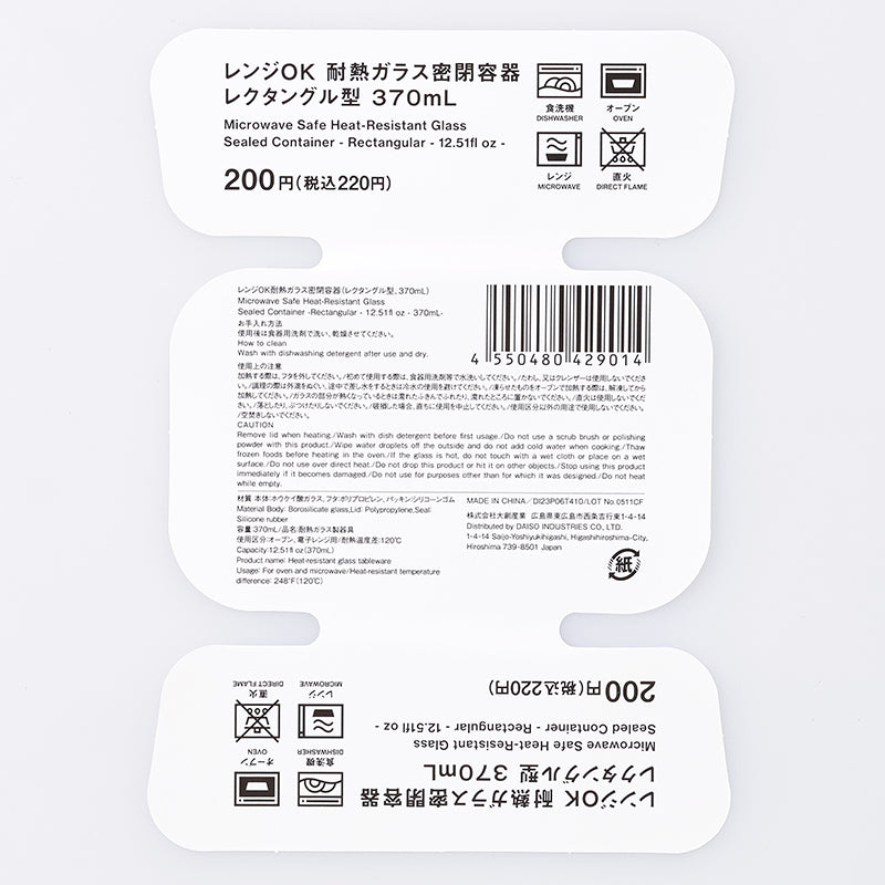 容量:370mL 品名:耐熱ガラス製器具 使用区分:オーブン、電子レンジ用 耐熱温度差:120℃●使用後は食器用洗剤で洗い、乾燥させてください。●加熱する際は、フタを外してください。●初めて使用する際は、食器用洗剤等で水洗いしてください。●たわし、又はクレンザーは使用しないでください。●調理の際は外滴をぬぐい、途中で差し水をするときは冷水の使用を避けてください。●凍らせたものをオーブンで加熱する際は、解凍してから加熱してください。●ガラスの部分が熱くなっているときは濡れたふきんでふれたり、濡れたところに置かないでください。●直火は使用しないでください。●落としたり、ぶつけたりしないでください。●破損した場合、直ちに使用を中止してください。●使用区分以外の用途で使用しないでください。●空焚きしないでください。