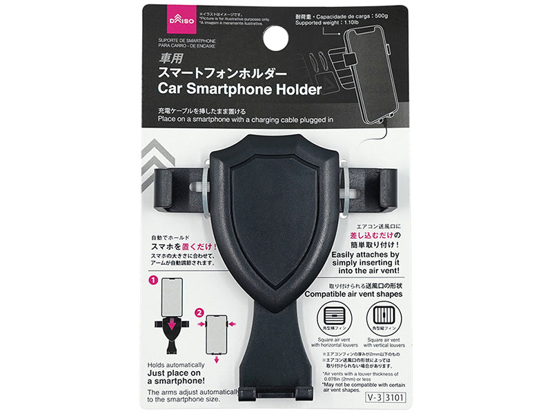 充電ケーブルを挿したまま置ける●イラストはイメージです。自動でホールド スマホを置くだけ! スマホの大きさに合わせて、アームが自動調節されます。 エアコン送風口に差し込むだけの簡単取り付け! 取り付けられる送風口の形状 ●エアコンフィンの厚みが2mm以下のもの ●角型横フィン または 角型縦フィン ※エアコンフィンのツマミには取り付けないでください。 取り付けられない送風口の形状 ●エアコンフィンの厚みが2mmを超えるもの ●丸型、特殊形状 ●送風口上部・下部が突き出ているもの、エアコンフィンの間隔が狭いものなど スマートフォンの対応サイズ 幅:65mm〜85mm、厚み12mmまで 角型横フィン 角型縦フィン 耐荷重:500g①クリップをエアコンフィンの向きに合わせて回転させ、エアコンフィンに差し込んでください。 ②本品にスマートフォンをセットしてください。スマートフォンの大きさに合わせて、アームが自動調節されます。 ※しっかりと固定されていることを確認してから使用してください。●お子様の手の届かない場所に保管してください。●本品に収納するスマートフォンの大きさや形状を確認し、設置場所の十分な検討を行った上で、安定して取り付けられない場合は使用しないでください。 ●エアコン送風口の形状によっては取り付けられない場合があります。 ●クリップの先端が送風口の奥に接触した状態や、無理な状態で取り付けた場合、送風口などが破損する恐れがありますので十分注意してください。 ●スマートフォンの側面に操作ボタン・イヤホン端子・充電端子などがある場合、収納時に側面の機能を使用できないことがあります。 ●保護ケースを装着していないスマートフォンを本品に収納した場合、本品と擦れてキズがつく恐れがあります。 ●無理に差し込んだ場合、クリップのラバー部分が破れて内部の金属パーツとエアコンフィンが擦れ、エアコンフィンが破損する恐れがありますので注意してください。 ●本革・合成皮革・表面が柔らかいダッシュボードなどには取り付けないでください。 ●スマートフォン収納時は、本品を取り付けた送風口から風を出さないでください。送風口にオートスイング機能が付いている場合は、機能スイッチをオフにしてください。 ●本品がしっかりと取り付けられていることを確認してから使用してください。不安定なまま使用すると外れて落ちる恐れがあります。 ●運転中の取り付け作業及びスマートフォンの操作・注視は大変危険ですので、必ず安全な場所に車を駐停車させてから使用してください。 ●悪路を走る際は使用しないでください。また、急発進・急ブレーキした場合、本品に収納したスマートフォンが落ちる恐れがありますので注意してください。 ●本品にスマートフォンを収納したまま直射日光の当たる場所で長時間放置しないでください。 ●本品を取り外した際、取り付け場所に日焼けや吸着の跡が残ることがあります。あらかじめご了承ください。 ●改造や修理をしないでください。●使用前に破損などがないか確認●運転・視界を妨げる、突起物として危険がある、安全装置の作動・効果を妨げる場所に取り付けない●定期的に状態を確認●無理な力や強い衝撃を与えない●変形・破損時は使用中止●火や熱源のそばに置かない●用途外に使用しない●本品使用目的以外の使用に起因するなど、本品の欠陥に基づかない損害については当社では責任を負いかねます。あらかじめご了承の上お買い求めください。