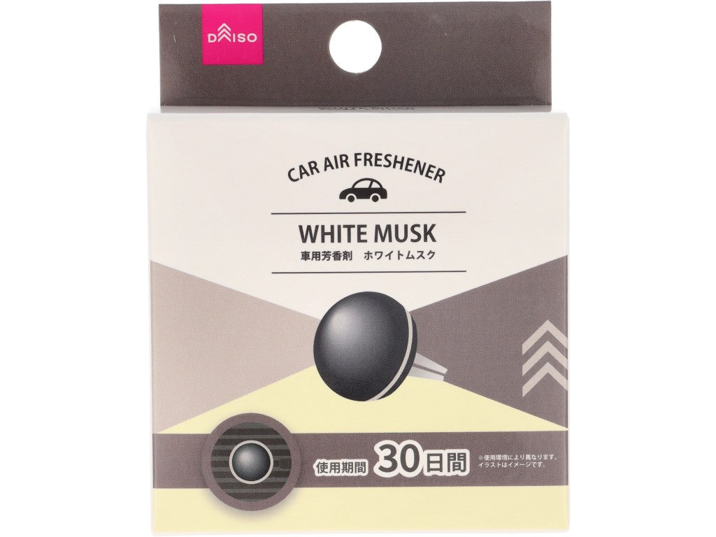 ホワイトムスクの香り使用期間:約30日①フタにクリップを差し込む②香りのタブレットを本体に入れる③フタをはめる④エアコン送風口に取り付ける●直射日光や高温多湿(60°C以上)、凍結する場所を避けて使用・保管してください。●使用中気分が悪くなった場合は直ちに使用を中止し、気分が回復しない場合は医師の診察を受けてください。●使用中はエアコンのスイング機能を作動しないでください。●万一、車内や衣類等に香料が付いてしまった場合、すぐに拭き取る等の対処をしてください。変色、変質する場合があります。●無理な力で差し込むとフィンやクリップが破損するのでご注意ください。●食べ物ではありません。絶対に口に入れないでください。●本来の用途以外に使用しないでください。●お子様やペットのいる場所で使用・保管しないでください。●運転や視界の妨げになる場所、突起物として危険の生じる場所、安全装置の作動・効果の妨げとなる場所に取り付けないでください。●飲み込んだ場合は吐かずにすぐ口をすすぎ、水か牛乳を飲ませ、ただちに医師に相談してください。●本品がしっかり固定されている事を確認してから使用してください。●走行中は取り付け、取り外しを行わないでください。●車内で使用する際は、運転操作や視界の妨げにならないようにしてください。