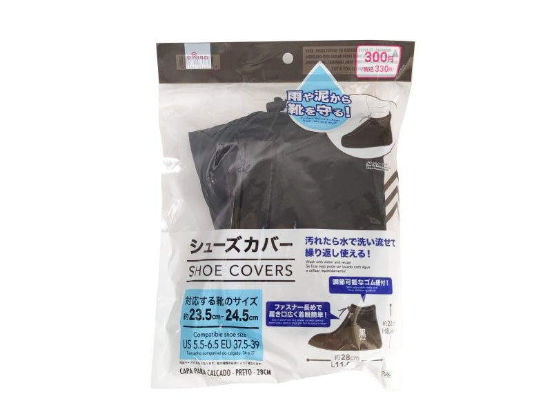 雨や泥から靴を守る! ファスナー長めで履き口広く着脱簡単! 調節可能なゴム紐付! 汚れたら水で洗い流せて繰り返し使える! 約28cmx約22cm●イラストはイメージです。対応する靴のサイズ:約23.5cmー24.5cm、推奨サイズは目安となります。靴の種類や形状によって異なります。1.ファスナーを開けて靴先から入れます。 2.かかとの方まで履き口を引っ張り上げて、そのまま履きます。 3.ファスナーを閉め、ゴムで脱げないように調節したら完成です。●完全防水ではありません。 ●激しい雨の時や長時間の使用により、内部に水が入ってくる場合があります。 ●靴の形状により入らない場合があります。 ●通気性がなく、内部が蒸れる場合があります。 ●タイルやマンホールなど、場所によっては滑りやすい場合があります。●サイズが合わない場合は使用しないでください。●強く引っ張らないでください。●火や熱源のそばに置かないでください。●本来の用途以外に使用しないでください。●長期間他の製品と密着させないでください。可塑剤の影響で変質、色移りの恐れがあります。