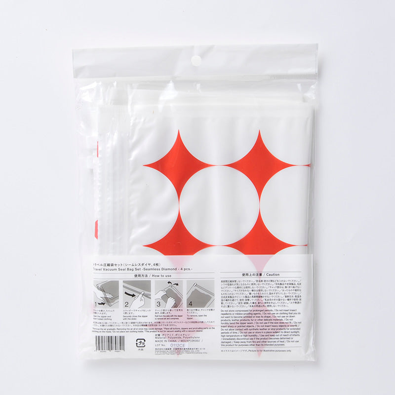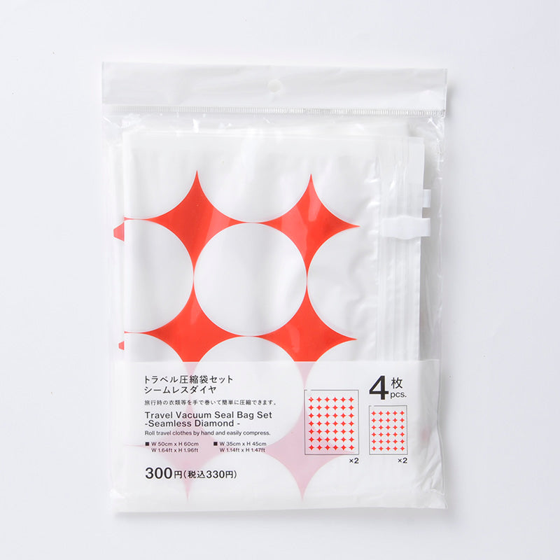 W 50cm x H 60cm 2枚 W 35cm x H 45cm 2枚 旅行時の衣類等を手で巻いて簡単に圧縮できます。●イラストはイメージです。①チャックを開け、たたんだ衣類を入れます。②スライダーでチャックをしっかり閉じます。③チャック側から巻いて空気を抜き、圧縮します。④取り出す際は、チャックを開けてください。※空気は徐々に抜いてください。一気に抜くと破損する恐れがあります。※衣類に付いたボタンやファスナーなどの突起物は内側にして入れてください。※濡れた衣類を入れないでください。※本品は掃除機で空気を抜くものではありません。長期間圧縮保管しないでください。防虫剤・防カビ剤などを入れないでください。シワや型崩れが気になるものに使用しないでください。羽毛製品や皮革製品、毛皮などデリケートな素材には使用しないでください。チャック部分は、強く折り曲げないでください。●サイズが合わない場合は使用しないでください。●尖ったものや鋭利なものを入れないでください。●重いものを入れたり、詰めすぎたりしないでください。●合成皮革製品やビニール製品と長期間接触させないでください。●直射日光・高温多湿の場所を避けて、使用・保管してください。●乳幼児の手の届かない場所で使用・保管してください。●変形・破損した場合、直ちに使用を中止してください。●火や熱源のそばに置かないでください。●本来の用途以外に使用しないでください。