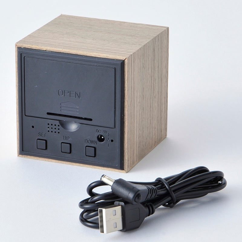 仕様 精度:平均月差±30秒 使用温度範囲:-10℃-50℃ 温度表示誤差:±2℃ 使用乾電池:乾電池単4形3本 乾電池寿命:乾電池のみ:約48時間/USBケーブル併用時:約1年6ヶ月 ●温度は-10℃以下の場合は「-10℃」、50℃以上の場合は「50℃」を表示します。単4形乾電池×3個(別売品) CR2032コイン電池×1個(別売品) ●充電式電池は使えません。 各部のなまえ 表面 アラーム表示 ●アラーム機能がONのとき「・」が点灯します。 午後表示 ●12時間表示のとき午後は「・」が点灯します。 時刻表示 ●「時/分」を表示します。 温度表示 ●温度表示のとき点灯します。 ●測定範囲-10℃-50℃ 例 裏面 電池ボックス ●単4形乾電池×3個(別売品) DCプラグ差込口 ●USBケーブルを使用するときDCプラグを差し込みます。 「SET」ボタン ●「SET」ボタンを長押しすると設定状態になります。 ●表示パターンを変更します。 「UP」ボタン ●画面の明るさを設定します。 ●設定中に押すと、数字が1つ進みます。 「DOWN」ボタン ●省エネ「入/切」を切り替えます。 ●設定中に押すと、数字が1つ戻ります。 ■付属品 USBケーブル ご使用の際には、ケーブルを主にお使いください。 ※当製品専用となります。 使用まえの準備 ●USBケーブルと乾電池を同時に使用してください。乾電池のみの場合、使用時間は約48時間となります。 ●2つの電源を同時に使用した場合、停電時や電源プラグをはずしても、乾電池からの給電により設定が保持されます。 USBケーブルのみ使用した場合、電源プラグをはずすと各設定がリセットされます。 ●通常はUSBケーブルからの給電を優先します。 ●USBケーブルを使わずに使いかけの電池を入れると、表示がすぐに消えることがあります。 1、乾電池をセットする(「電池交換のしかた」参照) 2、USBケーブルをセットする ①USBケーブルのDCプラグを、本体のDCプラグ差込口に差込む②USBケーブルのUSBプラグ(Type-A)をUSB電源アダプター(別売品)やUSBタップ(別売品)に差し込む 日付、12H/24H、時刻、アラーム、平日アラームON/OFFを設定する ①「SET」ボタンを長押しし、「年」を設定する。 「年」が点滅、「UPボタン」または「DOWNボタン」で設定。 ②「SET」ボタンを押し、同じように「月」「日」「12H/24H」「時」「分」「アラーム1のON/OFF」「アラーム1の時→分」「アラーム2のON/OFF」「アラーム2の時→分」「アラーム3のON/OFF」「アラーム3の時→分」「平日アラームのON/OFF」を順番的に設定する。「月」→「日」→「12H/24H」→「時」→「分」→「アラーム1のON/OFF」→「アラーム1の時→分」→「アラーム2のON/OFF」→「アラーム2の時→分」→「アラーム3のON/OFF」→「アラーム3の時→分」→「平日アラームのON/OFF」が点滅、「UPボタン」または「DOWNボタン」で設定。③「SET」ボタンを押し、設定をすべて確定する。 ※「UPボタン」または「DOWNボタン」を押し続けると数字が「早送り」または「早戻り」します。 ※設定モードの状態で15秒間放置すると、時刻表示に戻ります。 アラームON/OFFについて ●アラームは3種類設定できます。 ●設定中に「UPボタン」または「DOWNボタン」を押すたびに「ON」と「OFF」が切り替わります。 ●アラームを設定した時刻になると、アラーム音が「ピピピピ」と鳴る →アラーム音はどのボタンを押しても止まります。 または、約1分後自動的に止まります。 →アラーム音を止めても、アラーム設定は解除されません。 (翌日以降も鳴る設定のままです) 平日アラームON/OFFについて ●設定中に「UPボタン」または「DOWNボタン」を押すたびに「ON」と「OFF」が切り替わります。 ●平日アラームがONの場合:月曜日から金曜日までアラームが作動します。 ●平日アラームがOFFの場合:月曜日から日曜日までアラームが作動します。 表示パターンを設定する ●以下の2種類のパターンの中から、「現在の時刻」「月/日」「温度」の表示方法を選ぶことができます。 ●「SET」ボタンを押すたびに、「パターン1」→「現在の時刻」→「パターン2」→「現在の時刻」が切り替わります。 パターン1:「現在の時刻(10秒)」「月/日(3秒)」「温度(2秒)」の画面が交互に切り替わる ●「dp‐1」表示のときに、約5秒ボタン操作をしないと「現在の時刻」表示に戻り、自動的に「パターン1」に設定されます。 パターン2:「現在の時刻」のみ表示 ●「dp‐2」表示の時に、約5秒ボタン操作をしないと「現在の時刻」表示に戻り、自動的に「パターン2」に設定されます。 省エネ設定のしかた(消費電力を抑えるために一時的に表示を消す) ●「DOWN」ボタンを押すたびに、「省エネ:入」→「現在の時刻」→「省エネ:切」→「現在の時刻」が切り替わります。 「省エネ:入」に設定した場合 ●大きな音や振動、本体を軽くたたくことにより再び表示します。 ●約15秒操作しないと表示がすべて消えます。 ●アラームを設定した時刻になると、現在時刻を表示します。 アラーム音が止まってから約15秒後に再び表示が消えます。 初期設定は「省エネ:切」です。 「省エネ:切」