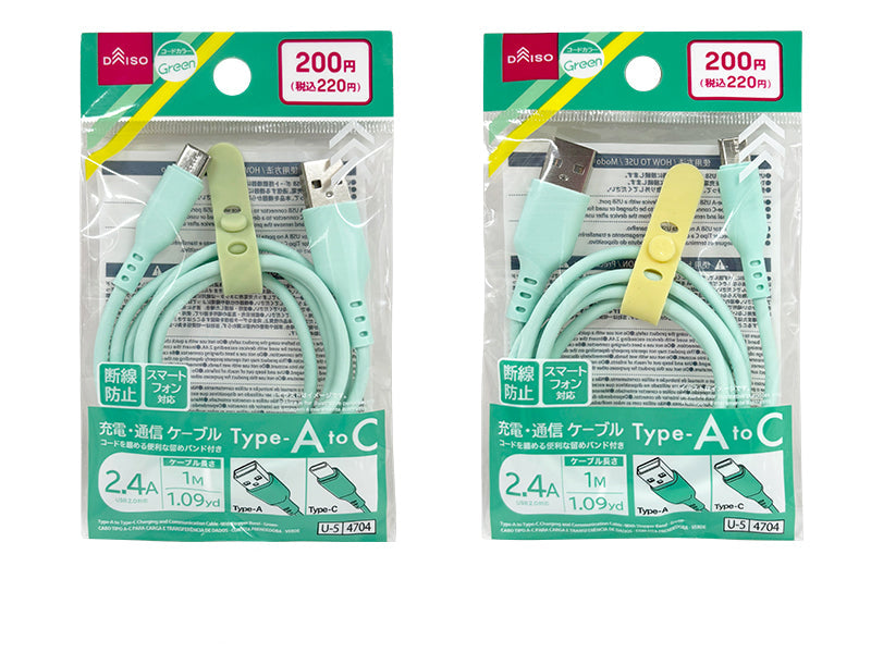 ●コードを纏める便利な留めバンド付き。 ●2.4A 充電・データ-通信。 ●ケーブル長さ:1m。 ●USB2.0対応。●USB AコネクタをUSBポート搭載機器に接続します。 ●Type-Cコネクタを充電、通信する機器に接続します。 ●使用後は端子を持って、本品を機器から取り外してください。●使用する前に、必ず読んで、安全に正しく使用してください。 ●急速充電器には使用しないでください。 ●コードバンドは強く引っ張らないでください。 ●2.4Aを超える機器には使用できません。 ●コネクターは接続方向を確認して、まっすぐ差し込んでください。 ●一度曲がってしまった充電用コネクターは絶対に使用しないでください。 ●コネクター内部に液体や異物が入らないように注意してください。 ●機器の仕様や環境によっては正常に作動しない場合があります。ご了承ください。●濡れた手で使用しないでください。●変形・破損した場合、直ちに使用を中止してください。●乳幼児の手の届かない場所で使用・保管してください。●直射日光・高温の場所を避けて、使用・保管してください。●本来の用途以外に使用しないでください。●本品の性質上、完全なデータ送信を保証することはできません。本品の使用においてデータの破壊または消失が発生した場合、原因や損害の内容に関わらず、当社は一切責任を負いません。事前にデータをバックアップすることをお勧め致します。