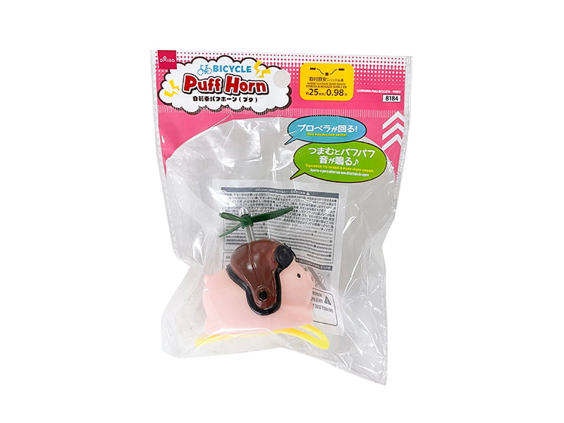 自転車パフホーン(ブタ)、プロペラが回る!つまむとパフパフ音が鳴る。取付目安:ハンドル径約25mm、本品は道路交通法上で使用できる警音器ではありません。装飾品としてお楽しみください。