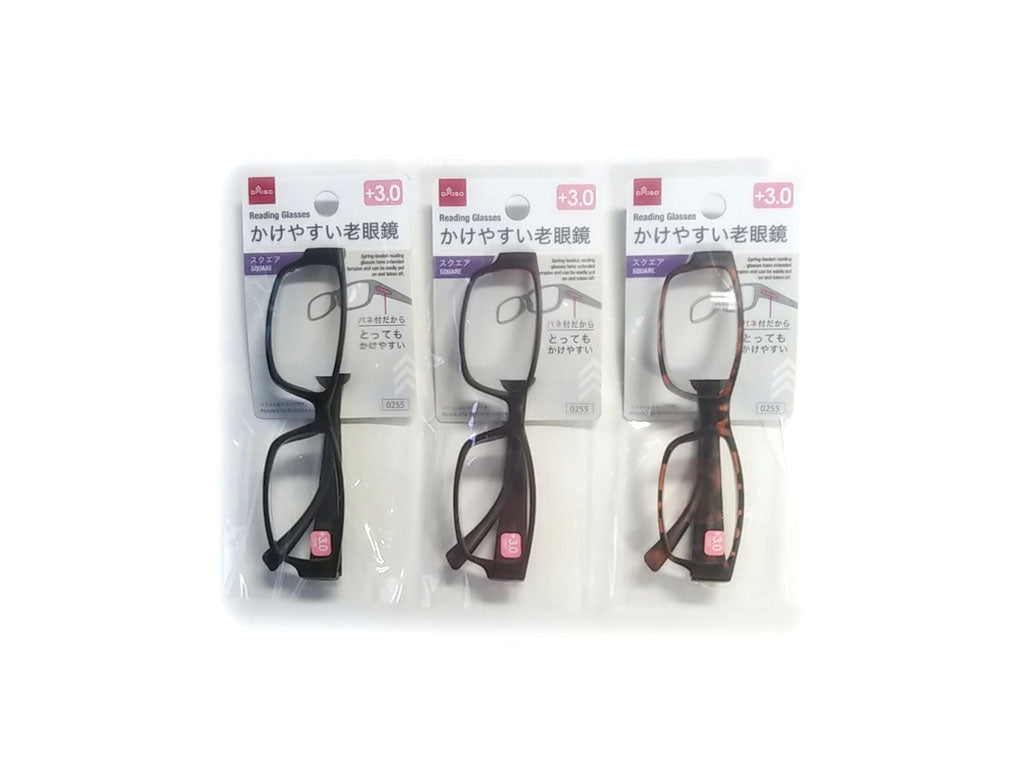 バネ付き老眼鏡はテンプルが広がり、楽に掛け外しができます。