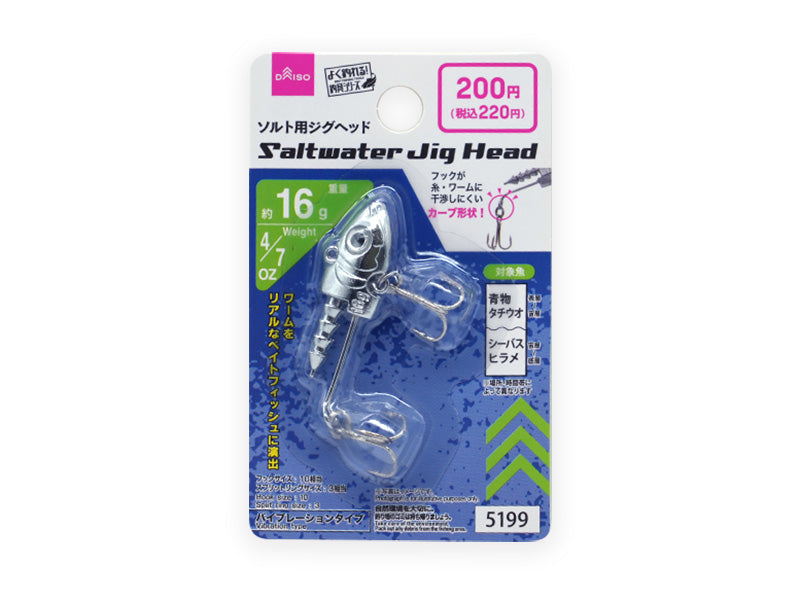 ただ巻きするだけでブルブルと震えて魚にアピールをするジグヘッドです。ヘッド部分がオモリになっておりワームを取り付けて釣りに使用します。ワームをリアルなベイトフィッシュに演出 バイブレーションタイプ フックが糸・ワームに干渉しにくいカーブ形状! 対象魚:シーバス、ヒラメ、青物、タチウオなど フックサイズ:10相当 スプリットリングサイズ:3相当シャッドテールワーム(別売)のくぼみを目印に、真っすぐになるようにジグヘッドの先端を差し込みます。 ルアーをキャストして、海底に着底したらリールを巻きます。 リールを巻く動作で、ルアーがブルブルと振動し魚を誘います。真水で洗った後水分を拭き取り、よく乾燥させます。●お子様の手の届かない場所に保管してください。●直射日光・高温多湿の場所を避けて、保管してください。●お子様が使用する際は、保護者と一緒に使用してください。●周囲の安全を確認した上で使用してください。●針先は鋭く大変危険です。取扱いには注意してください。●使用済のルアーは必ず持ち帰ってください。●火や熱源のそばに置かないでください。●本来の用途以外に使用しないでください。●自然環境を大切に。釣り場のゴミは持ち帰りましょう。