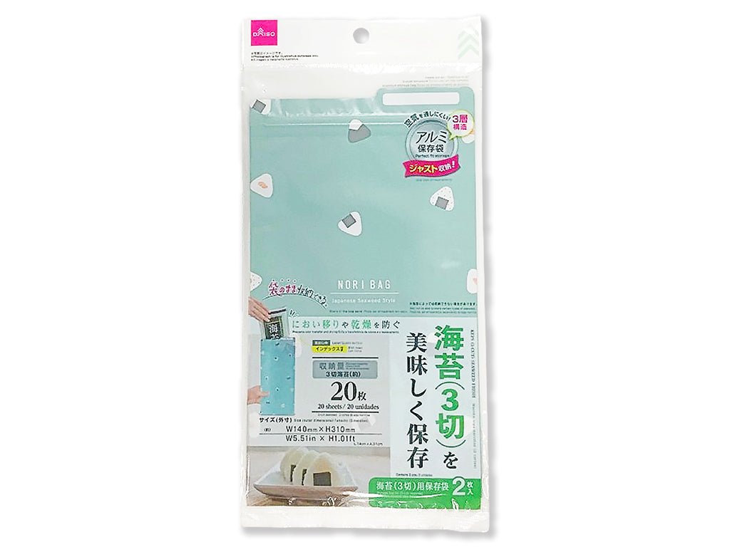 ●空気を通しにくい! ●3層構造 ●アルミ保存袋 ●ジャスト収納 ※海苔によっては収納できない場合があります。●におい移りや乾燥を防ぐ ●袋のまま収納できる ●海苔(3切)を美味しく保存 ●海苔(3切)用保存袋 ●2枚入 ●見出し枠 ●インデックス付き ●収納量 ●3切海苔(約)20枚 ●サイズ(外寸) ●(約)W140mm×H310mm ●写真はイメージです。●3切海苔の袋ごと入る便利な保存袋です。●酸素を通しにくいため乾燥から守り、おいしさを保ちます。●耐冷温度 -20℃ ●厚み:0.08mm チャックを開け海苔を入れます。チャックを閉める際は中の空気を抜きながら閉めてください。●本品は繰り返し使用できますが、傷みが出てきた場合は新しいものに交換してください。●お子様の手の届かない場所に保管してください。●海苔は湿気やすい食品のため、乾燥剤等を入れてください。また、開封後は早めにチャックを閉めて保存してください。●チャック部分に海苔のくずが挟まったまま閉じると破損の原因となる場合があります。●チャック部分を折り曲げないでください。●電子レンジは使用しないでください。●本来の用途以外に使用しないでください。●火や熱源のそばに置かないでください。●破損した場合、直ちに使用を中止してください。●食器洗い機・食器乾燥機は使用しないでください。