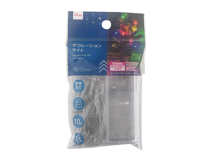 ●電池別売●単3形 乾電池 2本使用●連続点灯時間:約24時間●※自社調べ●※未使用電池の場合●ライトの色 カラフルミックス(赤・青・緑・黄)●長さ 1.5m●写真はイメージです。●電圧:1.5V×2個 3.0V●電流:0.088A●消費電力:0.26W●電池別売●単3形 乾電池 2本使用●電池の入れ方●①フタをスライドして開けます。●②電池を正しい方向でセットします。●③フタをスライドして閉じます。●点灯方法●スイッチをON方向にスライドするとライトが点灯します。●スイッチをOFF方向にスライドするとライトが消灯します。●※イラストはイメージです●直射日光・高温多湿の場所を避けて、保管してください。●For ages 15 and up●光を直視しないでください。●LEDは熱を持つことがあります。使用中、使用直後は触らないでください。●光の色や明るさにばらつきが出る場合があります。●電球の交換はできません。●特定の色の光が弱くなった場合は、新しい電池に交換してください。●金属部分でケガをしないように、取り扱いに注意してください。●玩具ではありません。●新しい電池と古い電池、種類の違う電池を混ぜて使用しないでください。●二次電池(充電式電池)は、絶対に使用しないでください。●液漏れした電池は使用しないでください。●電池はプラスマイナスを正しくセットしてください。●長期間使用しない場合は電池を外してください。●長期間他の製品と密着させないでください。可塑剤の影響で変質、色移りの恐れがあります。●屋外で使用しないでください。●分解や改造をしないでください。●強く引っ張らないでください。●水で濡らさないでください。●指や首に巻き付けないでください。●乳幼児の手の届かない場所で使用・保管してください。●変形・破損した場合、直ちに使用を中止してください。●火や熱源のそばに置かないでください。●本来の用途以外に使用しないでください。