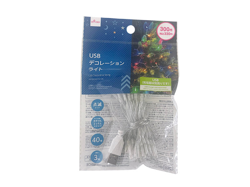●USB(充電器は別売りです)●ライトの色 カラフルミックス(赤・青・緑・黄)●長さ 3m●写真はイメージです。●LEDを使用したやさしい光で屋内を飾り付けます●電圧:5.0V●消費電流:0.074A●消費電力:0.37W●USBポートに正しい方向で挿入すると点灯します。●USBポートから抜くと消灯します。●給電にはACアダプター/モバイルバッテリーの出力DC5Vの物を使用してください。●※急速充電機器は使用しないでください。●※ACアダプターとモバイルバッテリーは付属しておりません。●※イラストはイメージです。●直射日光・高温多湿の場所を避けて、保管してください。●For ages 15 and up●光を直視しないでください。●LEDは熱を持つことがあります。使用中、使用直後は触らないでください。●光の色や明るさにばらつきが出る場合があります。●電球の交換はできません。●給電にはACアダプター・モバイルバッテリーの出力DC5Vの物を使用してください。●急速充電機器は 使用しないでください。●金属部分でケガをしないように、取り扱いに注意してください。●玩具ではありません。●長期間他の製品と密着させないでください。可塑剤の影響で変質、色移りの恐れがあります。●屋外で使用しないでください。●分解や改造をしないでください。●強く引っ張らないでください。●水で濡らさないでください。●指や首に巻き付けないでください。●乳幼児の手の届かない場所で使用・保管してください。●変形・破損した場合、直ちに使用を中止してください。●火や熱源のそばに置かないでください。●本来の用途以外に使用しないでください。
