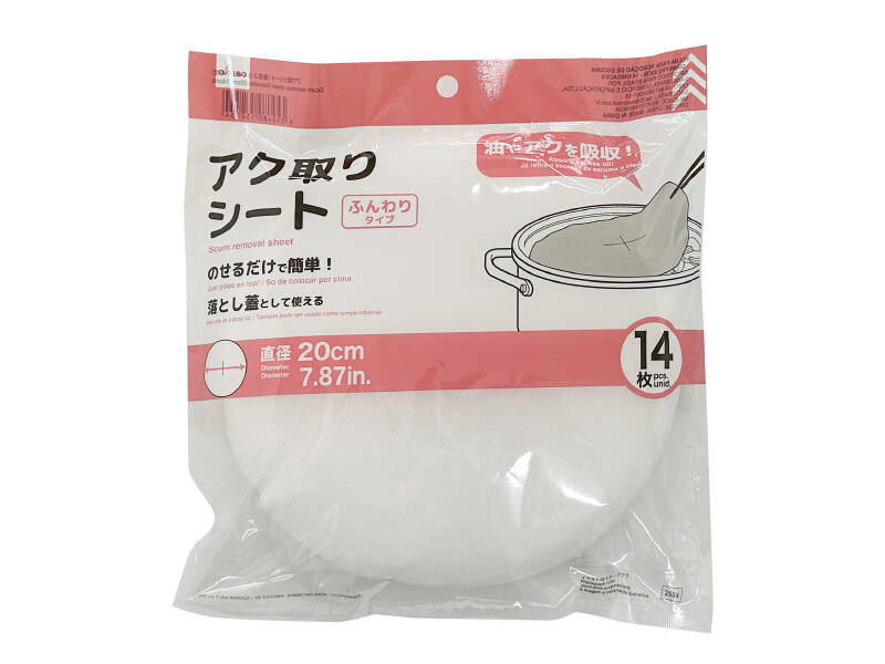 落とし蓋として使える シートの浮き上がりを防ぐスリット入り 直径約20cm のせるだけで簡単! 油やアクを吸収! ふんわりタイプ オーブンNO 直火NO ●イラストはイメージです。のせておくだけで、シートがアクや余分な油を吸収します。落とし蓋の効果で、材料に味がしっかりしみこみ煮くずれしにくくなります。1、鍋に具材と水やだし汁を加えた後、煮る前にシートを1枚のせてください。2、シートをのせたままで煮るだけで、アクや油を吸い取ります。アクや油が大量に出る場合は、途中で新しいシートに取り替えてください。取り替え時は火を止めてください。3、具材が煮えたら火を止め、箸などでシートを取り出してください。シートを鍋に入れる時、取り出す時は、火を止め、箸などで慎重に取り出してください。鍋や煮汁でやけどをする恐れがあります。シートを鍋に入れる時は鍋からシートがはみ出したり、鍋にくっついたりしないように注意してください。鍋の大きさを確認の上使用してください。使用時は1枚で使用してください。重ねて複数枚で使用するとシートが浮き上がりふきこぼれる場合があります。調圧弁をふさぐ可能性があるため、圧力鍋や炊飯器では使用しないでください。鍋底に敷いて使用したり、電子レンジやオーブン・オーブントースターで使用したり、揚げ物の敷き紙や油こしとして使用したりしないでください。本品は水に溶けません。水洗トイレや流しには流さないでください。●直火、オーブンは使用しないでください。●直射日光・高温多湿の場所を避けて、使用・保管してください。●お子様の手の届かない場所で使用・保管してください。●火や熱源のそばに置かないでください。●本来の用途以外に使用しないでください。