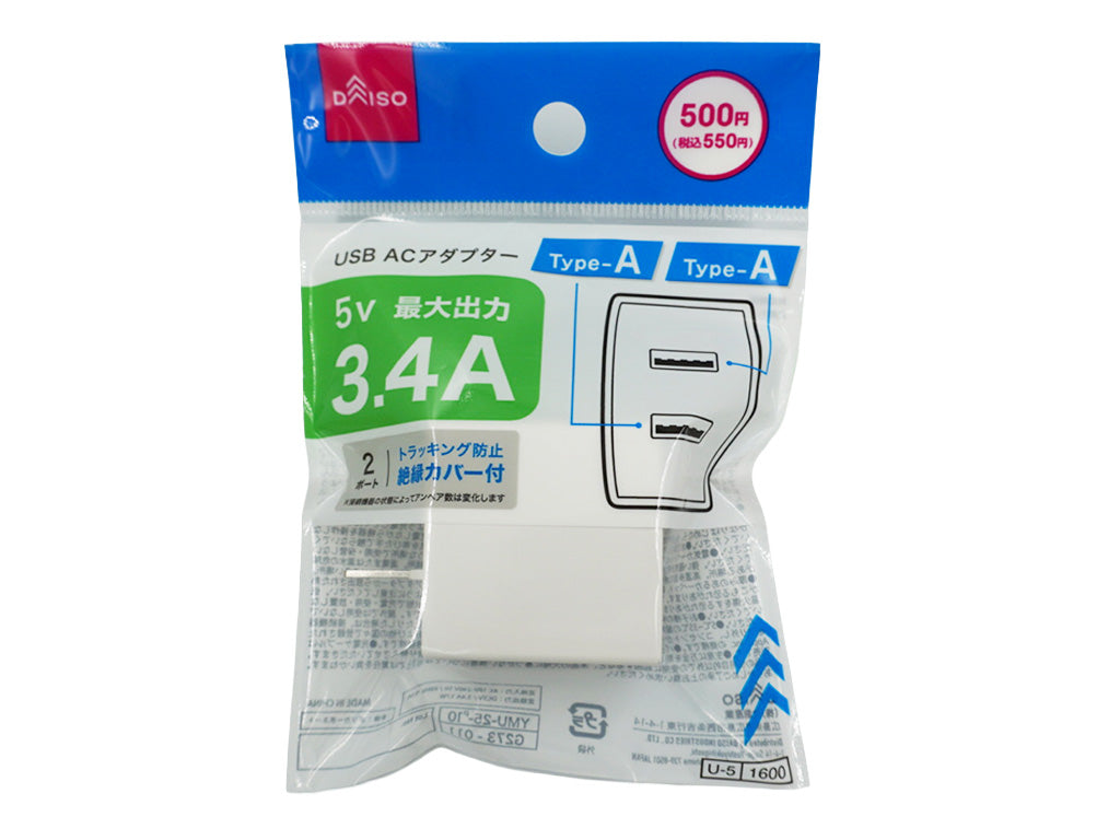 5V 最大出力3.4A 2ポート トラッキング防止絶縁カバー付 2口同時使用時は1A+2.4A※接続機器の状態によってアンペア数は変化します Type-A Type-A対応機種 iPhone用/iPad用/Android スマートフォン用、タブレット用 定格入力:AC 100-240V 50-60HZ 0.5A 定格出力:DC5V/3.4A 17W①本品のプラグを家庭用コンセントに差し込みます。②USB Type-Aの規格に準拠したケーブルを本品のUSB Type-Aポートに差し込みます。※USB Type-Aポートを同時使用時は最大17Wで動作し出力は変動します。10°C~40°Cの環境下で保管してください。(結露なきこと)本品を安全にご使用いただくために、ここに記載されている警告・注意事項を必ずお読みになり内容をよく理解された上でご使用ください。ここに記載の警告・注意事項を守らない場合、お客さまや第三者の方々への危害(負傷・障害・死亡)、財産への損害(故障・破損・破壊・損失)を与えたり、その原因となる可能性があります。本来の用途以外、本書に記載以外の方法での使用は絶対に行わないでください。●Apple製品を充電する際は、Apple 純正或いは、認証取得済のケーブルを使用してください。●USB Type-Aの規格に準拠したケーブルをご使用ください。規格外のケーブルは使用しないでください。●すべての機種への充電を保証するものではありません。機種によっては充電できない場合があります。●非認証品のケーブルは使用しないでください。火災や感電、故障の原因となる恐れがあります。●USBからの充電に対応していない機器を接続しないでください。●本品のUSB Type-Aポートから変換コネクタを使用して充電しないでください。●本品のUSB Type-Aポートに、USBハブなどを使用して複数のUSB標器を接続しないでください。●指定の電圧以外の電源では絶対に使用しないでください。異常発熱、発火、感電、ケガや故障の原因になります。●モバイルバッテリー等、対応機種以外は充電しないでください。●差し込み口にホコリやゴミが入らないよう、十分注意してください。●コネクターは、まっすぐ差し込んでください。一度曲がってしまったコネクターは使用しないでください。コネクター内部に液体や異物が入らないように注意してください。●接続機器の充電が完了した状態のまま放置しないでください。●長期間電源コンセントに差し込んだまま放置しないでください。充電動作に入らない場合や、発熱・発煙・異臭がする場合は使用を中止してください。●本品を使用しない場合は電源や接続機器から取り外してください。●分解や改造をしないでください。●落としたり、ぶつけたりしないでください。●ケーブルを極端に曲げるなど、ケーブルに負荷をかけないよう充電してください。●雷がなりはじめたら、安全のため本品や接続されている各機器にさわらないでください。●充電しながら機器を操作しないでください。●水で濡らさないでください。●濡れた手で使用しないでください。●静電気を帯びた手で触らないでください。●電子カーペットの上、暖房器具の近所で使用しないでください。●本品を次のような場所で使用・保管しないでください。強い磁気が発生する場所。静電気、電気的ノイズが発生する場所。結露する場所。漏電または漏水の危険がある場所。高温多湿の場所。直射日光の当たる場所。火気の周辺、または、熱気のこもる場所。ホコリの多い場所。●厚みのあるカーペット、寝具、または家具からアダプタを離して便用してください。アダプタから放出された熱がこもる恐れがあります。アダプタを使用する際は、皮膚がアダプタ表面に触れないように注意してください。低温火傷をする恐れがあります。●座布団の上、布団や毛布、枕などの寝具で覆われている状態で充電・使用・放置しないでください。●お子様の手の届かない場所で使用・保管してください。●本品は屋内専用です。屋外では使用しないでください。●5℃~35℃の屋内環境以外で使用しないでください。●万一煙が出たり異臭がしたりした場合は、接続機器を取り外し、コンセントか本品を取外してください。●仕様および外観は、性能改良ための予告なく変更することがあります。●iPhone、iPod、iPadは米国および他の国々で登録されたApple Inc.の商標です。●パッケージに記載の会社名及び商品名は、各社の商標または登録商標です。●充電ケーブルは別売です。●生産に万全を期しておりますが、万一不良の場合にはお買い上げ店にてお取り替えさせていただきます。本品使用目的以外の使用に起因するなど、本品の欠陥に基づかない損害については当社では責任を負いかねます。あらかじめご了承の上お買い求めください。
