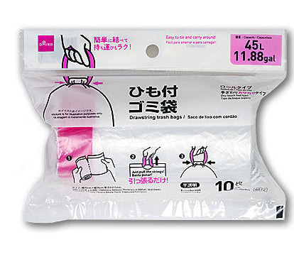 ○簡単に結べて持ち運びもラク!○引っ張るだけ!○ひも付ゴミ袋●イラストはイメージです。○非食品用○ロールタイプ○手ざわりカサカサタイプ○半透明○耐冷温度:-30℃○寸法:横700mm×縦760mm 厚さ0.015mm ○枚数:10枚○取扱上の注意:火のそばに置かないでください。お子様がかぶったりすると危険です。保管には十分ご注意ください。1.ミシン目部分に親指をあて切り取ってください。2.袋を広げ、中にゴミを入れてください。3.ひもを露出部から引っ張ってください。この時強く引っ張ると破損の原因となりますので、ゆっくりと引っ張ってください。●乳幼児の手の届かない場所に保管してください。●直射日光・高温多湿の場所を避けて、保管してください。○食品は直接入れないでください。○ひもはゆっくり引っ張ってください。●尖ったもの・鋭利なものを入れない●重いものを入れたり詰め過ぎない●火や熱源のそばに置かない●用途外に使用しない