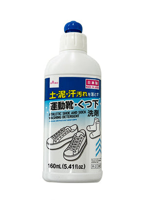 土・泥・汗汚れを落とす!●イラストはイメージです。●品名/洗濯用合成洗剤(家表法対象) ●用途/上履き・運動靴(水洗いが可能なもの)、くつ下(綿・麻・合成繊維用)●液性/アルカリ性 ●正味量/160mL ●使用量の目安/運動靴:靴片方の洗浄に対して容器の側面を軽く1押し(約7mL)の量。靴下:靴下片方に対して容器の側面を軽く2押し(約14mL)の量。●運動靴:濡らしたブラシなどに原液を適量つけて、こすり洗いしてください。洗浄後は水ですすぎ洗いをしてください。 ●靴下:原液を汚れた部分に適量塗り込み、手揉みを十分に行った後に通常の洗剤の入った洗濯機で洗ってください。●お子様の手の届かない場所に保管してください。●使用の際にはゴム製等の手袋又は柄付きたわしを使用してください。 ●色・柄物は事前に原液を目立たない部分につけ、しばらく置いて色落ちのない事を確認の上使用してください。又、塗り込まない洗濯物であっても本品が入った液で同時に洗う場合は同様のテストを実施してください。 ※窓ガラス・鏡などのガラス製品に洗剤がつくと、乾燥後に凝固して落ちにくくなり、くもりの原因になります。 応急処置 ●万一飲み込んだ場合は、水を飲ませてください。●本来の用途以外に使用しないでください。●目に入った場合は、すぐに洗い流してください。●異常を感じた場合は医師に相談してください。