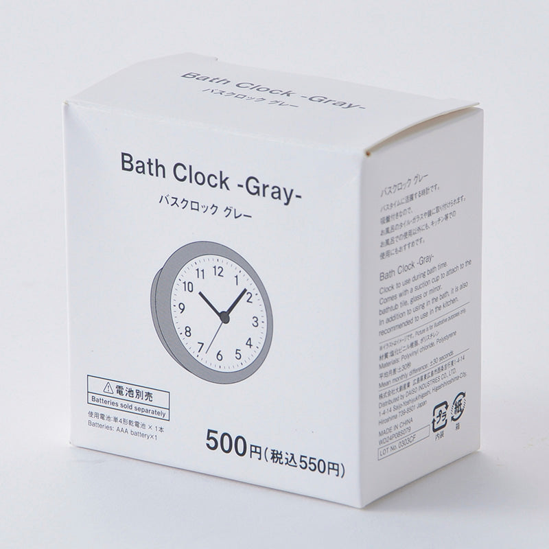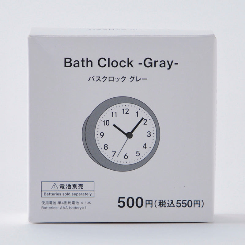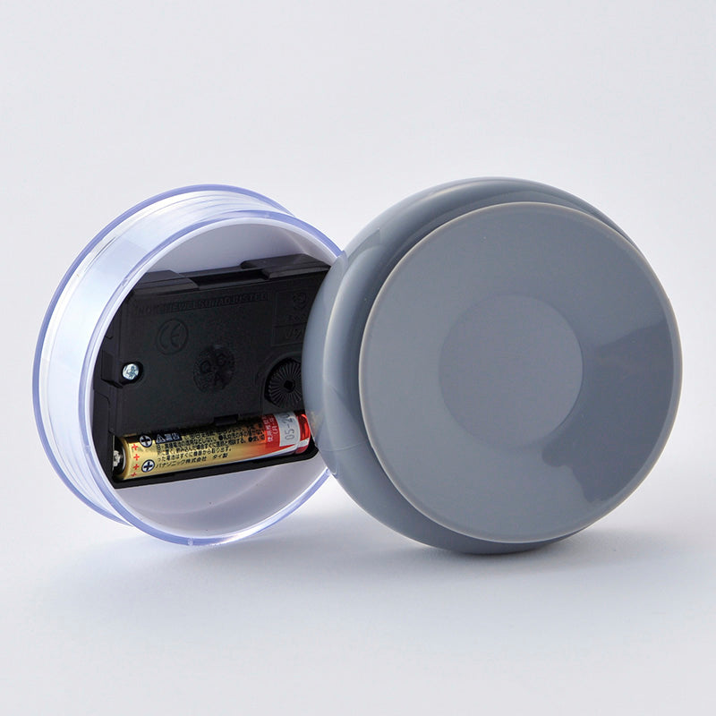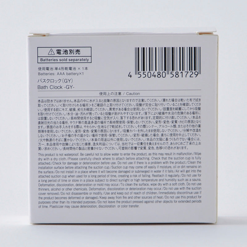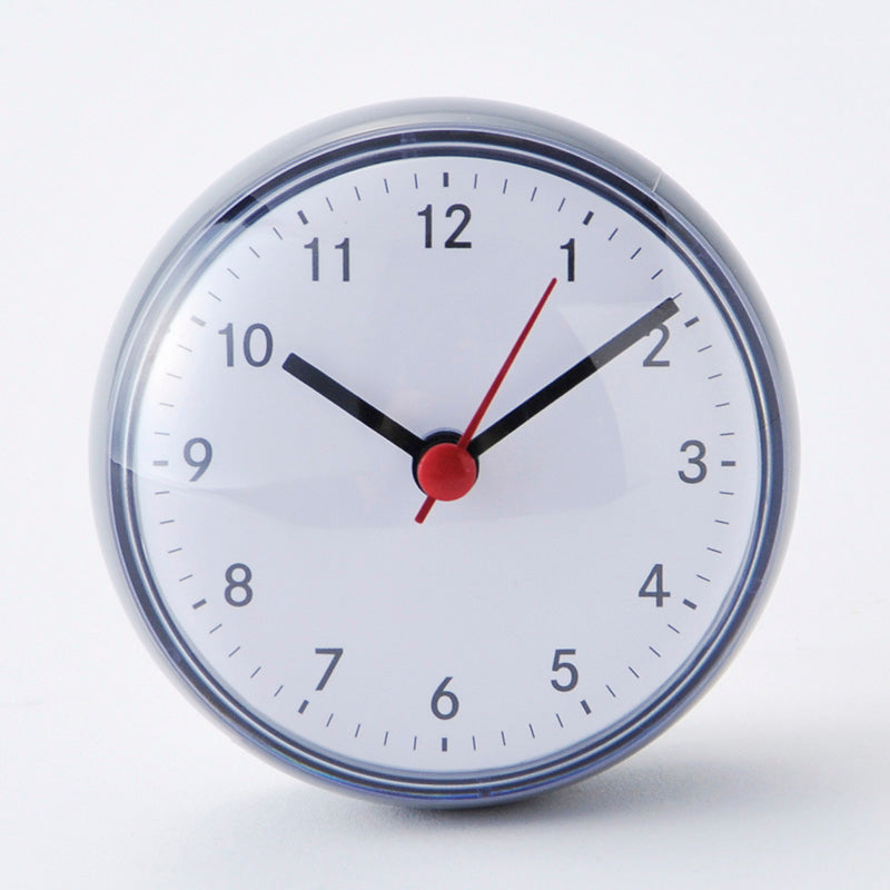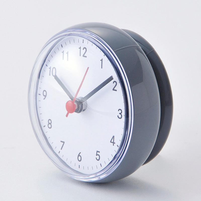 バスタイムに活躍する時計です。 吸盤付きなので、お風呂のタイル・ガラスや鏡に取り付けられます。 お風呂での使用以外にも、キッチン等での使用にもお薦めします。電池は別売りです。 使用電池:単4形乾電池x1本<時計の合わせ方> 時刻セットつまみを矢印の方向にまわして現在の時刻を合わせます。 ※アラーム機能は付いていません。 <電池の入れ方> 吸着カバーから時計をゆっくりと取り外し、乾電池は+から入れて-を押し込んでください。外すときも+から取り出してください。 時計が止まったり、遅れたりした場合、新しい乾電池と交換してください。<取り付けられる場所> 吸盤より大きい平たいタイル・ガラス・鏡面 ※破損の恐れがある薄いガラスや傷の入ったガラス面で使用しないでください。 <取り付けられない場所> 凹凸面、ざらざら面、曲面、木、モルタル、すりガラス、金属塗装面、プリント合板、取り付け面が高温になる場所、水分・異物が付着した場所●本品は防水ではありません。本品の中に水が入ると故障の原因となりますので注意してください。 ●濡れた場合は乾いた布で拭き取ってください。 ●<取り付けられる場所>をご確認の上取り付けてください。吸盤が完全に貼り付いている事を確認してください。 ●使用する前にキズ、破損、劣化を確認してください。異常がある場合は使用しないでください。 ●設置面を綺麗にしてから吸盤を取り付けてください。 ●水分・油・汚れが残っていると吸盤が剥がれやすくなります。 ●落下により破損や水没の危険のある場所には設置しないでください。 ●長時間使用すると吸盤に空気が入り、落下する恐れがあります。定期的に付け直してください。 ●本品を直射日光の当たる場所、サウナ等の高温多湿の場所で長時間使用・保管しないでください。変形・変色・変質・カビの原因となります。 ●表面のお手入れをする際は、やわらかい生地などで乾拭きしてください。その際シンナー、アルコール類、またはその他の薬剤等を使用しないでください。変形・変色・変質の原因になります。 ●吸着カバーを外したまま使用しないでください。 ●長期間他の製品と密着させないでください。可塑剤の影響で変質、変色、色移りの恐れがあります。●分解や改造をしないでください。●お子様の手の届かない場所で使用・保管してください。●変形・破損した場合、直ちに使用を中止してください。●火や熱源のそばに置かないでください。●本来の用途以外に使用しないでください。●本品の欠陥に基づくものでない場合には、万一、本品使用や故障により生じた損害、逸失利益については、当社では一切責任を負えませんので、あらかじめご了承の上お買い求めください。●長期間他の製品と密着させないでください。可塑剤の影響で変質、色移りの恐れがあります。