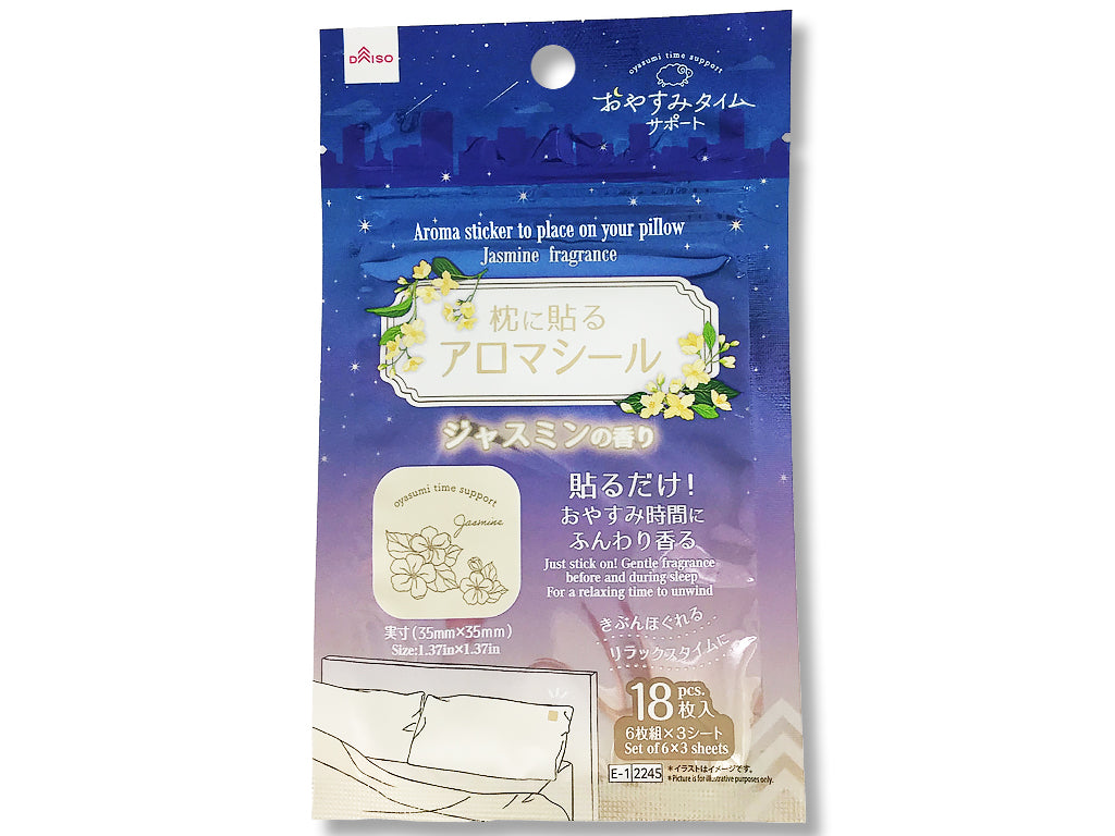 おやすみサポート ジャスミンの香り 貼るだけ!おやすみ時間にふんわり香る 実寸 こころほぐれるリラックスタイムに 18枚入 6枚組×3シート●イラストはイメージです。枕に貼るだけ簡単アロマシールです。 就寝時に枕に貼るとアロマの香りでリラックスできるシールです。 ジャスミンの甘くエキゾチックな香り 絵柄は2種類シールをはがして枕やシーツなど、就寝時に香りを感じやすい所に貼り付けてください。 芳香持続時間の目安は約7時間です。(使用方法や使用環境により異なります)肌に直接貼らないでください。 妊産婦、乳幼児へのご使用はおすすめしておりません。 開封後はチャックをしっかりと閉じ、1か月を目安に使い切ってください。 未開封のまま長期間保管した場合、香りが劣化する場合があります。 肌に直接あたりそうな所には貼らないでください。 アレルギー症状やかぶれを起こしやすい体質の人は、注意して使用してください。 生地などの材質によっては、のり残りや生地を傷める場合があります。 長時間貼り付けたままにしないでください。 シールを貼ったまま洗濯しないでください。 貼り付ける場所に香りが移ります。あらかじめご了承ください。 剥離紙に香料の染み出しが見られることがあります。 使用場所の素材により、まれに香料が染み出すことがあります。●食品ではない、口に入れないで!●子どもやペットのいる場所で使用・保管しない●刺激・異常を感じたらただちに使用を中止、医師に相談●目立たない部分で試してから使用●火や熱源のそばに置かない●用途外に使用しない