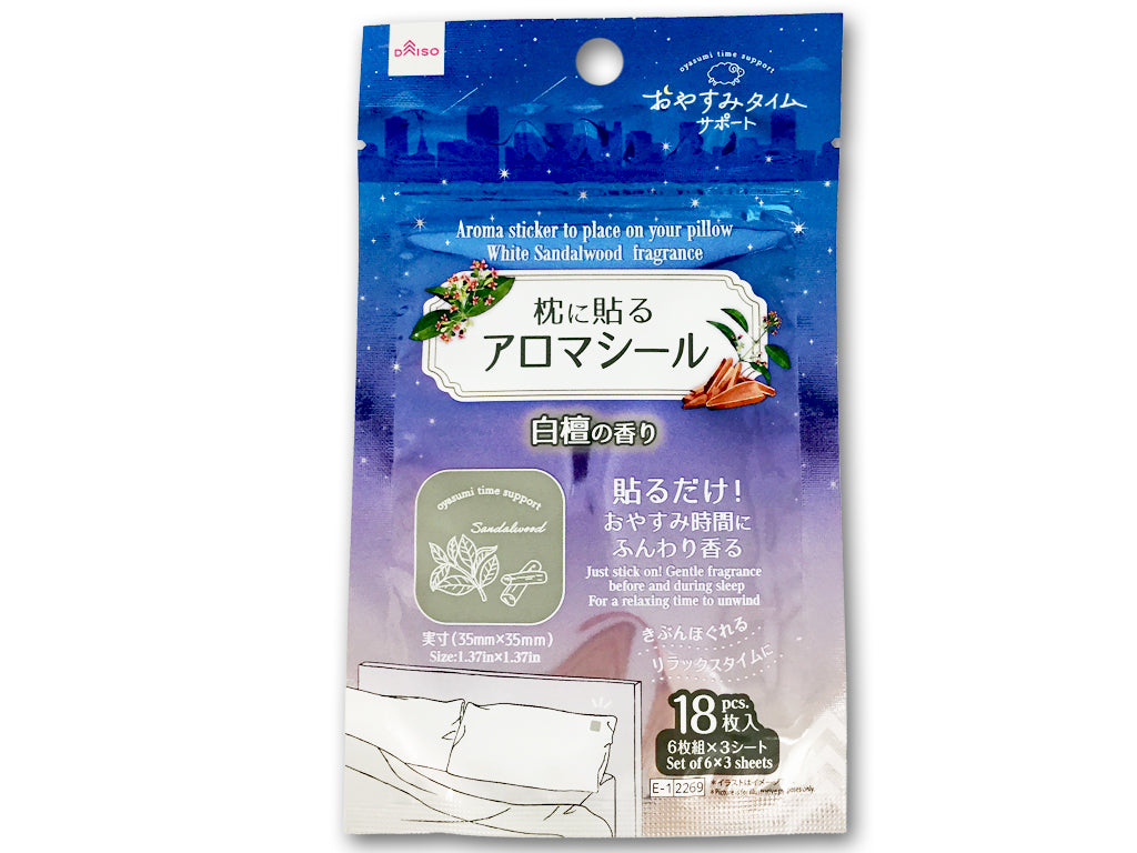 おやすみサポート カモミールの香り 貼るだけ!おやすみ時間にふんわり香る 実寸 こころほぐれるリラックスタイムに 18枚入 6枚組×3シート●イラストはイメージです。枕に貼るだけ簡単アロマシールです。 就寝時に枕に貼るとアロマの香りでリラックスできるシールです。 白檀の甘さのあるウッディな香り 絵柄は2種類シールをはがして枕やシーツなど、就寝時に香りを感じやすい所に貼り付けてください。 芳香持続時間の目安は約7時間です。(使用方法や使用環境により異なります)●直射日光・高温多湿の場所を避けて、保管してください。肌に直接貼らないでください。 妊産婦、乳幼児へのご使用はおすすめしておりません。 開封後はチャックをしっかりと閉じ、1か月を目安に使い切ってください。 未開封のまま長期間保管した場合、香りが劣化する場合があります。 肌に直接あたりそうな所には貼らないでください。 アレルギー症状やかぶれを起こしやすい体質の人は、注意して使用してください。 生地などの材質によっては、のり残りや生地を傷める場合があります。 長時間貼り付けたままにしないでください。 シールを貼ったまま洗濯しないでください。 貼り付ける場所に香りが移ります。あらかじめご了承ください。 剥離紙に香料の染み出しが見られることがあります。 使用場所の素材により、まれに香料が染み出すことがあります。●食品ではない、口に入れないで!●子どもやペットのいる場所で使用・保管しない●刺激・異常を感じたらただちに使用を中止、医師に相談●目立たない部分で試してから使用●火や熱源のそばに置かない●用途外に使用しない