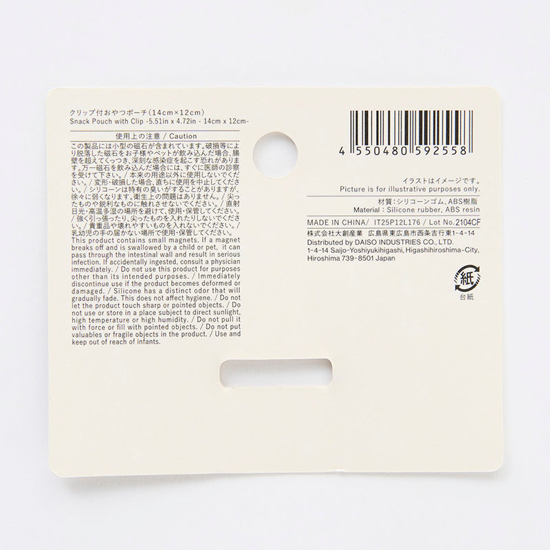 本体サイズ :14cm×12cm×6.5cm クリップ付きで、外出時の携帯に便利。 洗いやすくて乾きやすい。 固定に便利なクリップ付 ペット用 開口部はマグネット付き、片手で簡単に食べ物や軽食を入れたり、持ち出したりすることができます●イラストはイメージです。この製品には小型の磁石が含まれています。破損等により脱落した磁石をお子様やペットが飲み込んだ場合、腸壁を超えてくっつき、深刻な感染症を起こす恐れがあります。万一磁石を飲み込んだ場合には、すぐに医師の診察を受けて下さい。●本来の用途以外に使用しないでください。●変形・破損した場合、直ちに使用を中止してください。●シリコーンは特有の臭いがすることがありますが、徐々に弱くなります。衛生上の問題はありません。●尖ったものや鋭利なものに触れさせないでください。●直射日光・高温多湿の場所を避けて、使用・保管してください。●強く引っ張ったり、尖ったものを入れたりしないでください。●貴重品や壊れやすいものを入れないでください。●乳幼児の手の届かない場所で使用・保管してください。